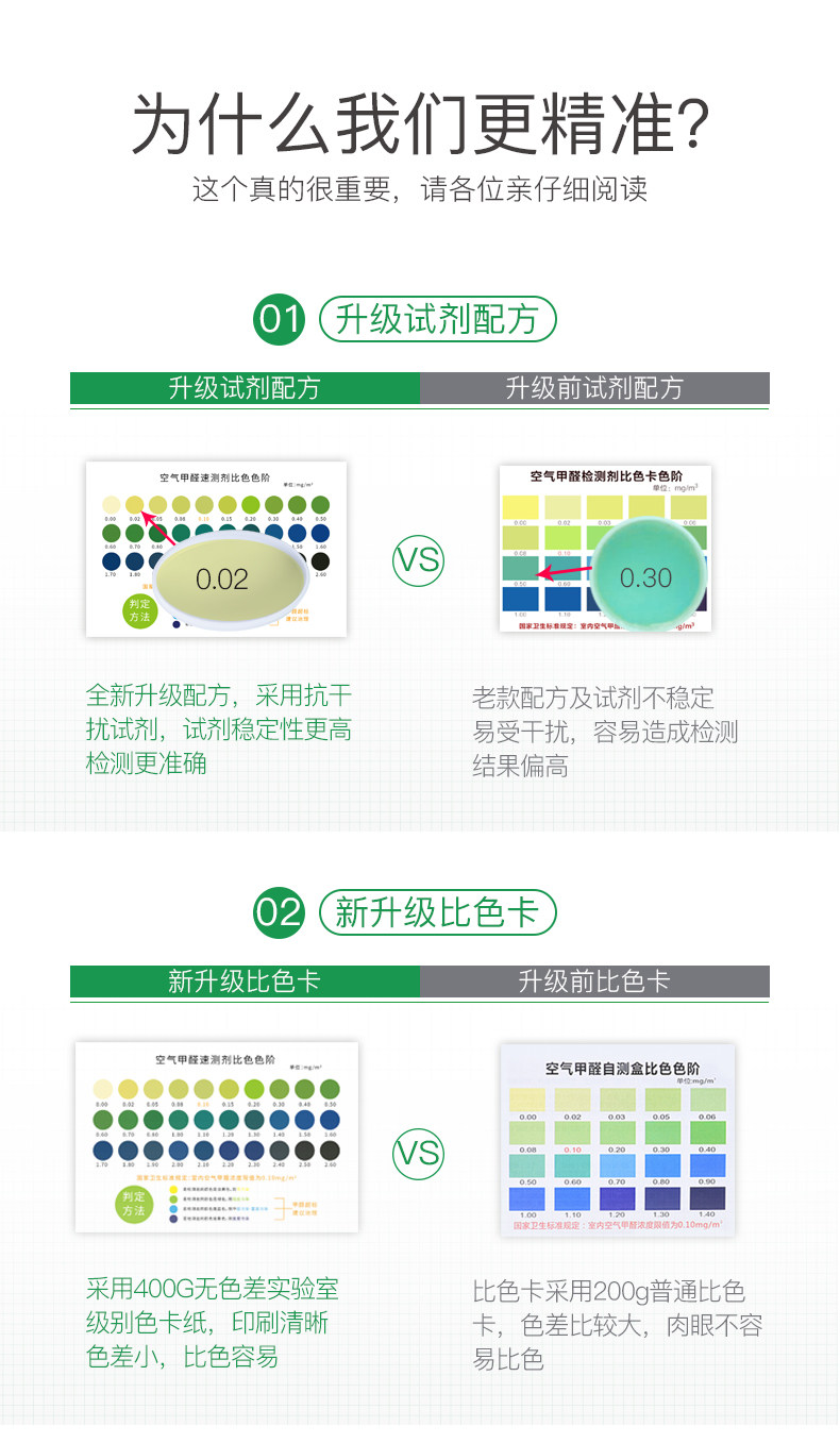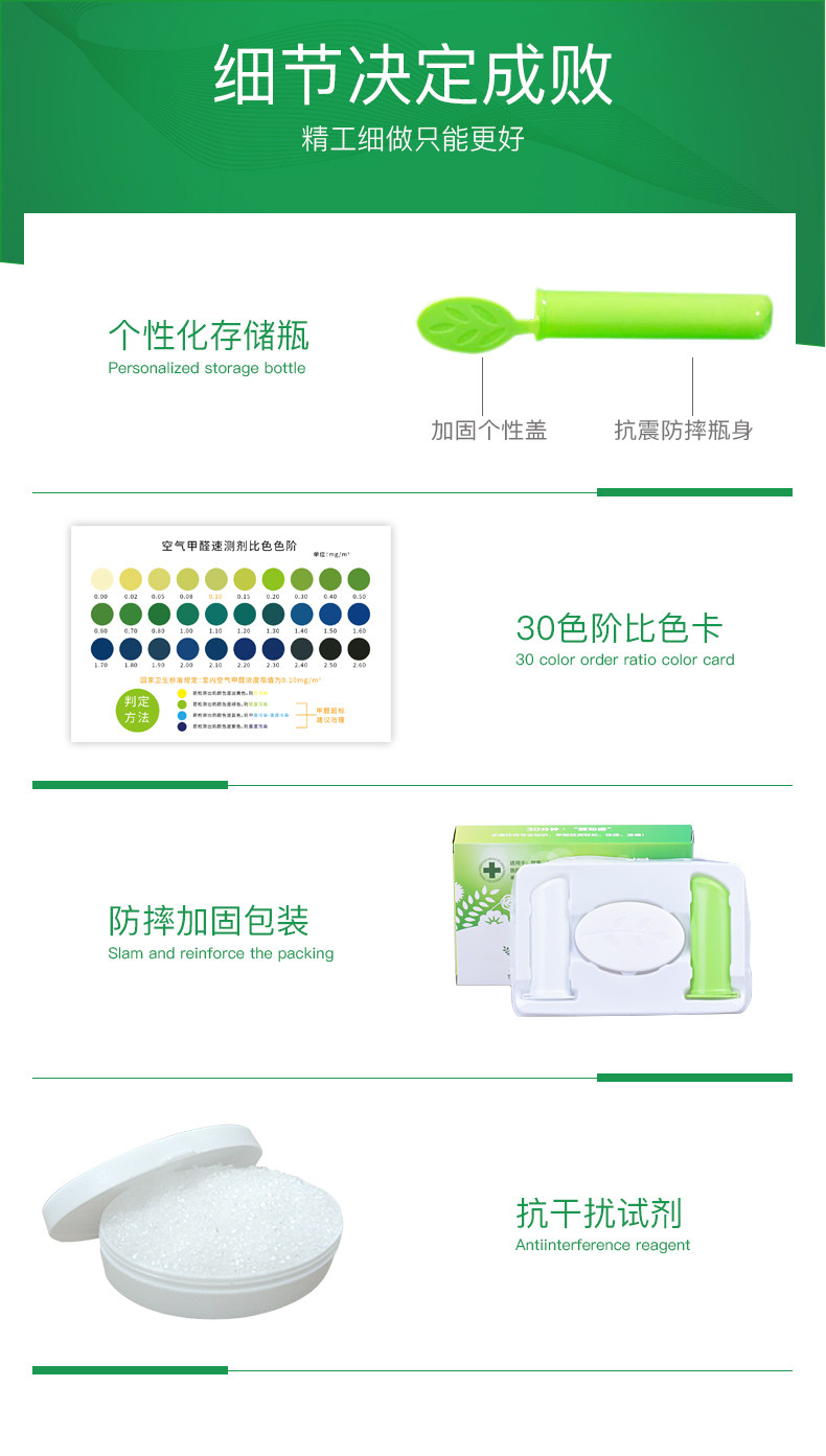 用了5盒,放在不同的地方,包括卧室、鞋柜、客厅等地方,检测的颜色竟然都一样,倒进绿色小瓶里的液体以后的颜色几乎没变,都是很浅的浅黄。而前几天用上次拍的试剂,各地方却有明显不同。这次拍不免让人怀疑质量问题。