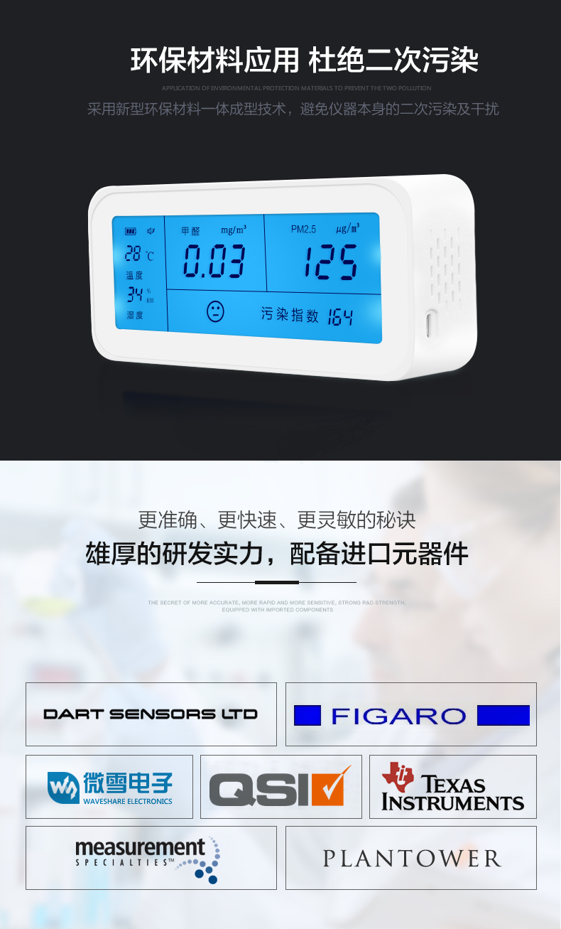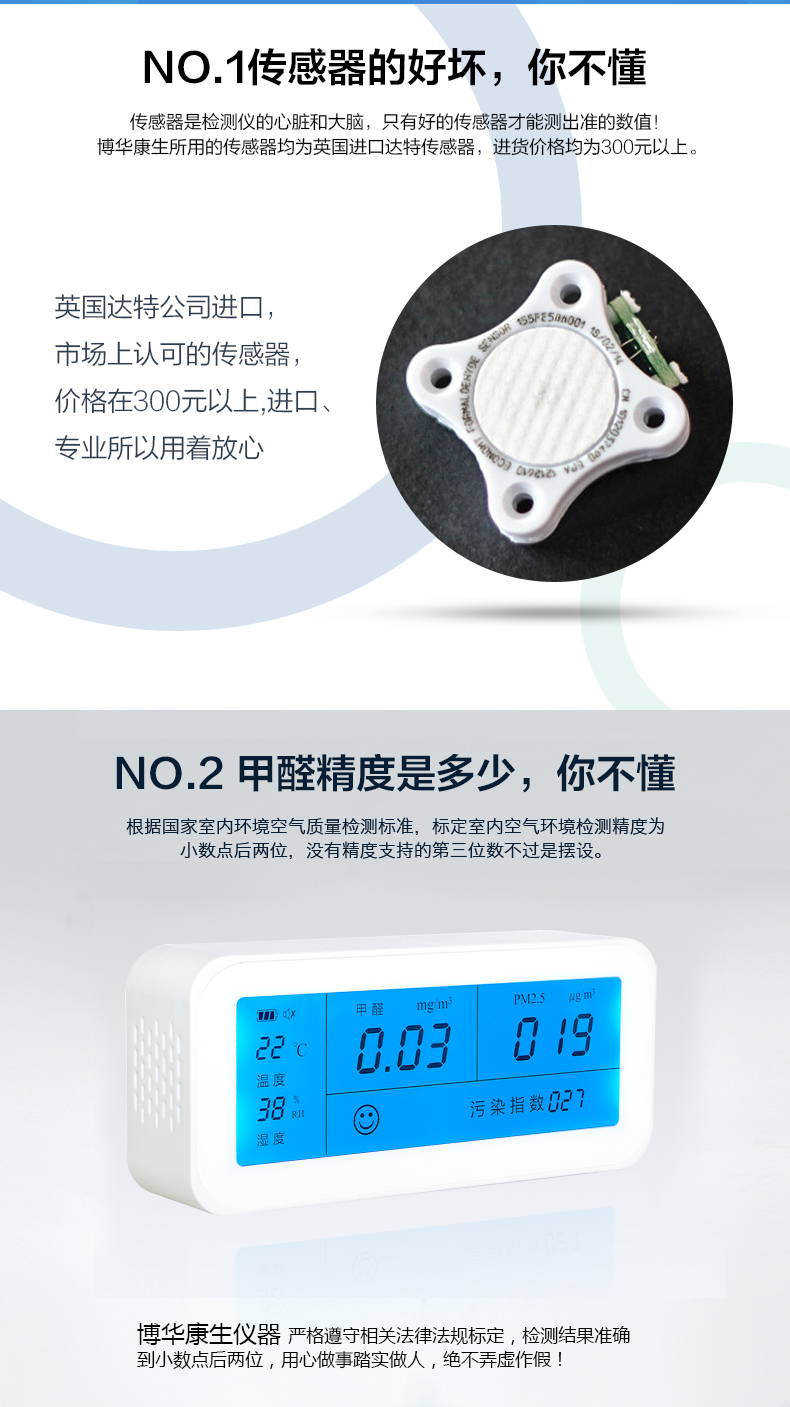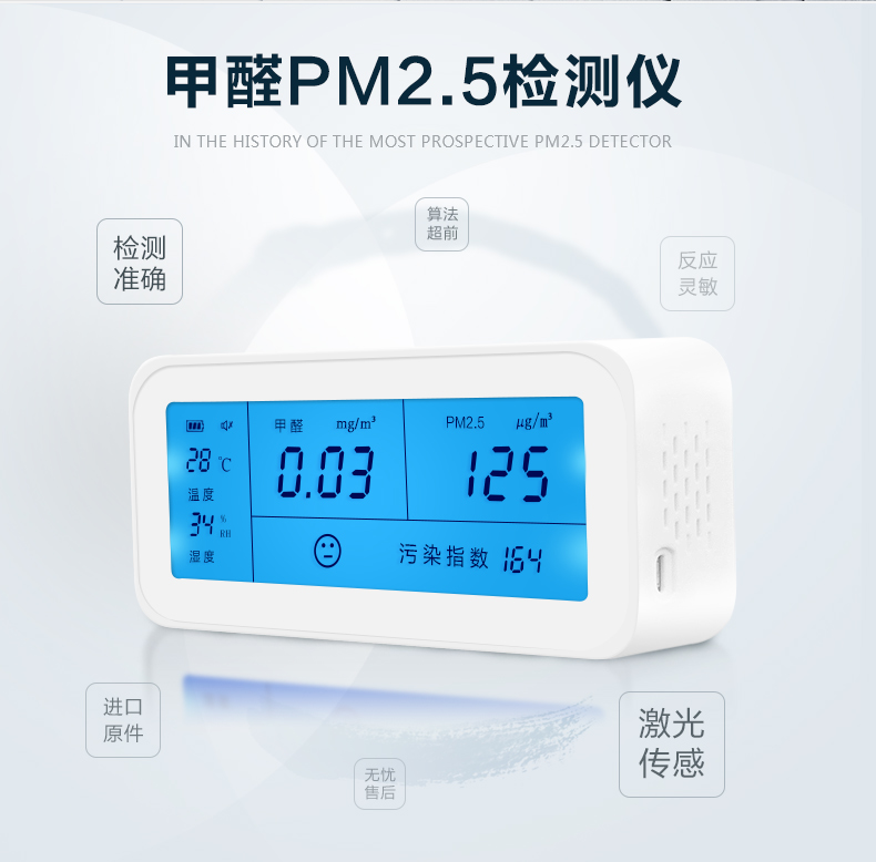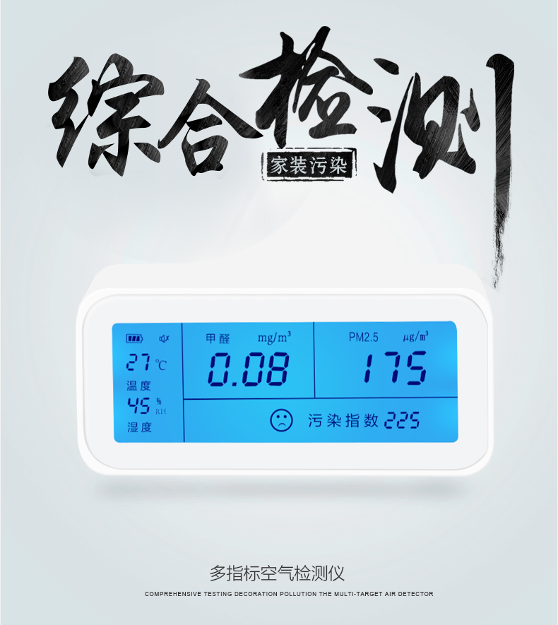 检测方便,比用试剂要快半小时,也可反复使用。还可以看室内温度与湿度,室内温度受右边的孔的传感影响,在右边加温可令温度值马上升高。湿度在空调房开空调后变化明显。甲醛检测值和污染检测值灵敏变化。