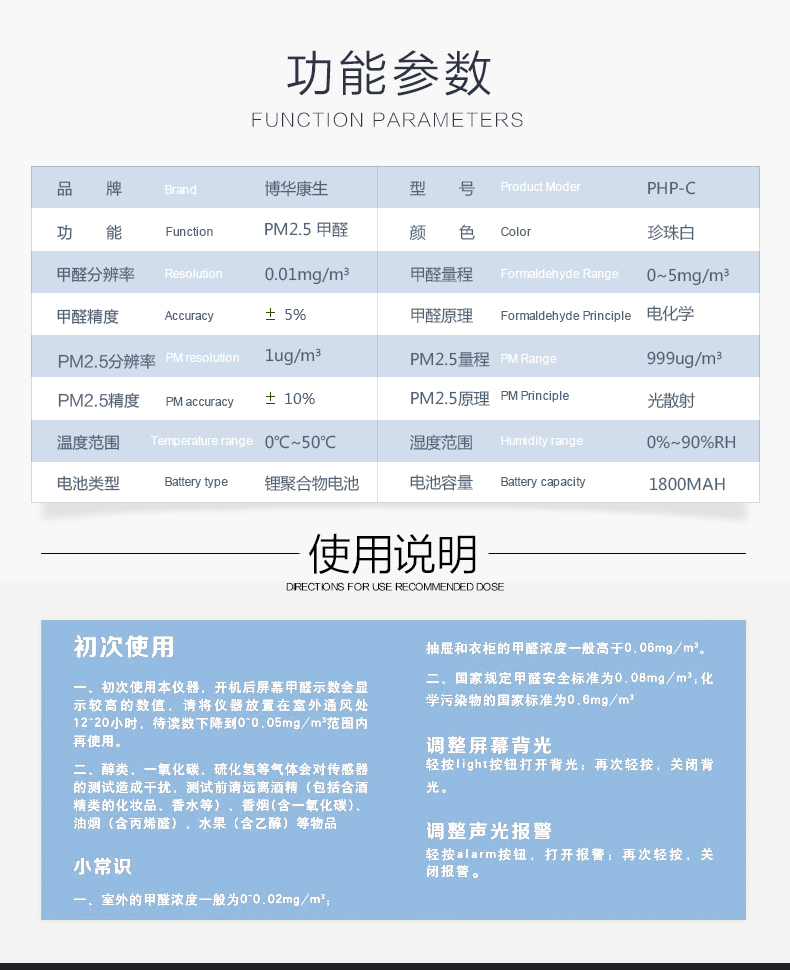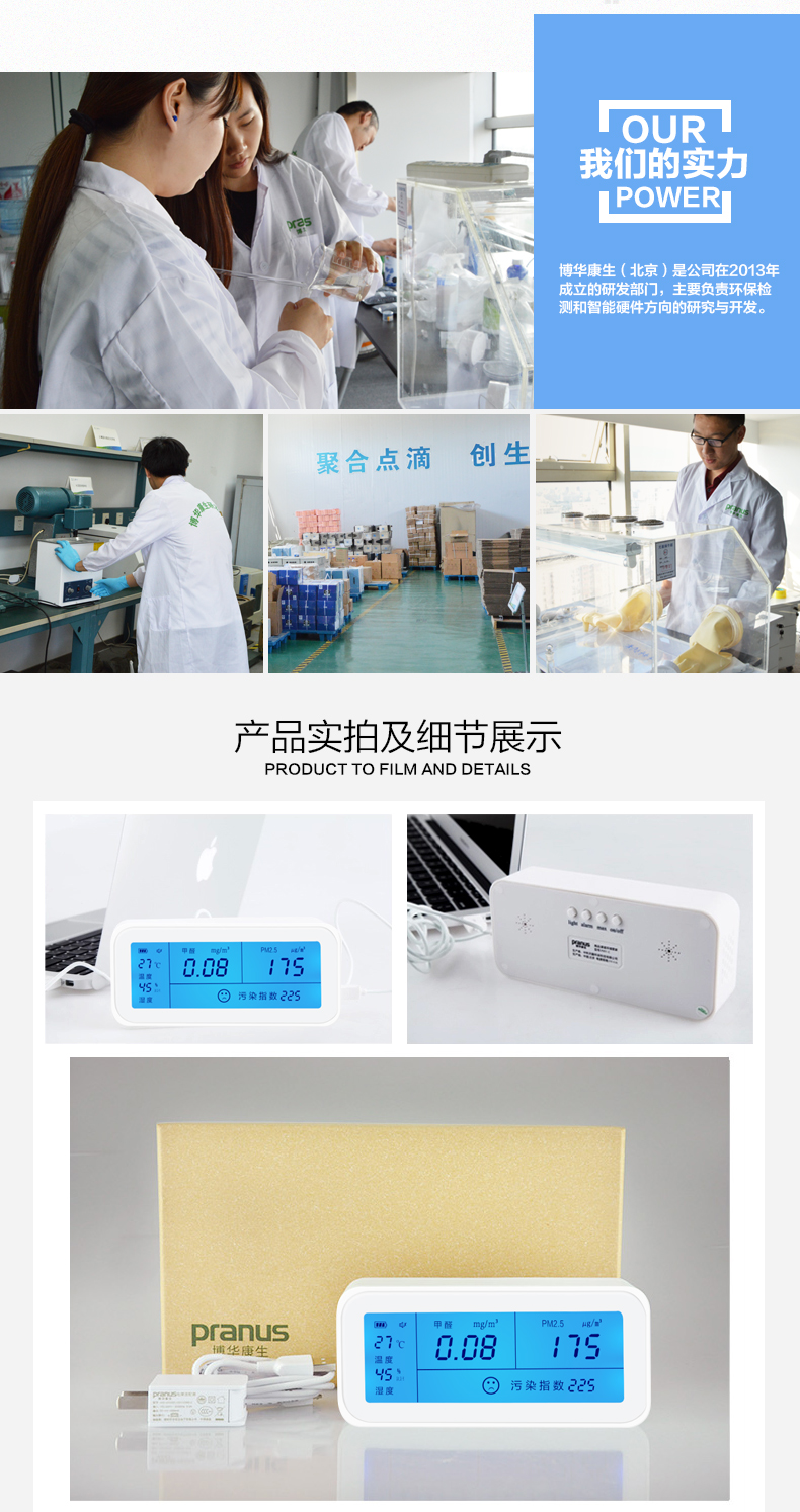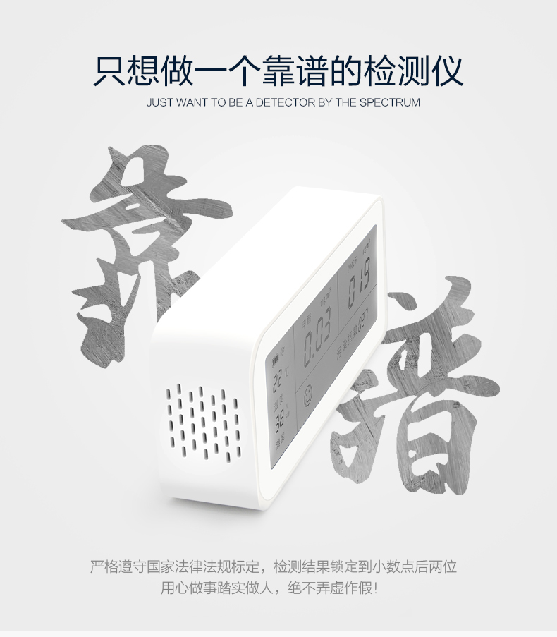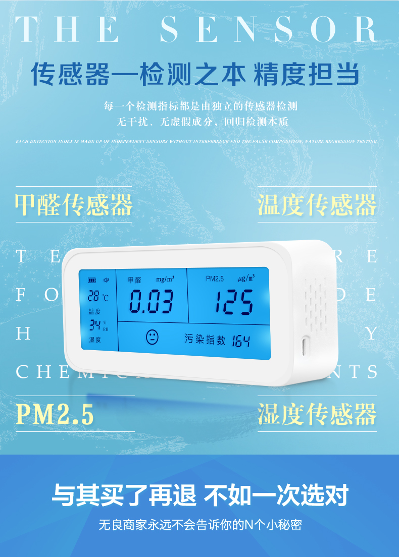 检测方便,比用试剂要快半小时,也可反复使用。还可以看室内温度与湿度,室内温度受右边的孔的传感影响,在右边加温可令温度值马上升高。湿度在空调房开空调后变化明显。甲醛检测值和污染检测值灵敏变化。