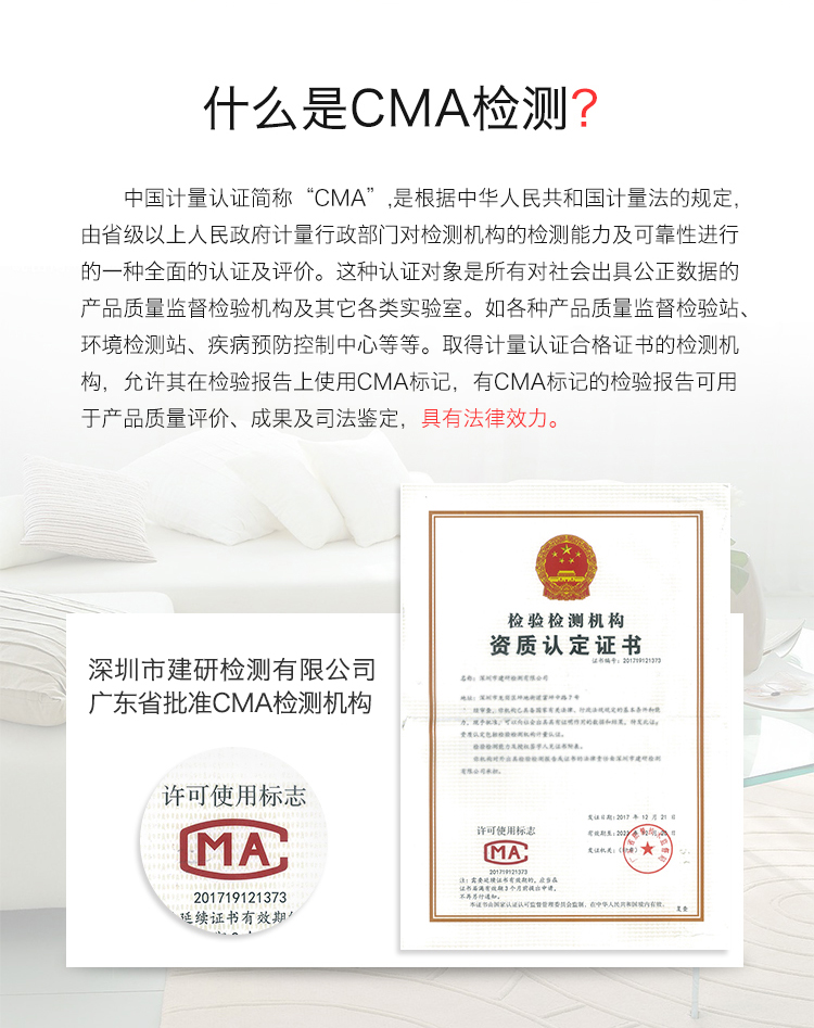 本来想做材料检测的,但是费用好贵啊,测不起,后来客服建议我先做个CMA检测维权。还是不错的,把我的床退了,谢谢你们。