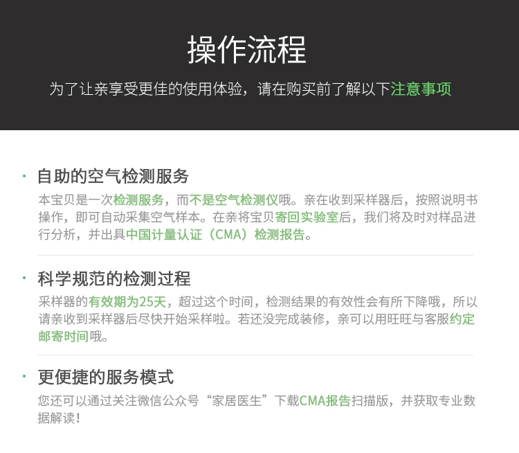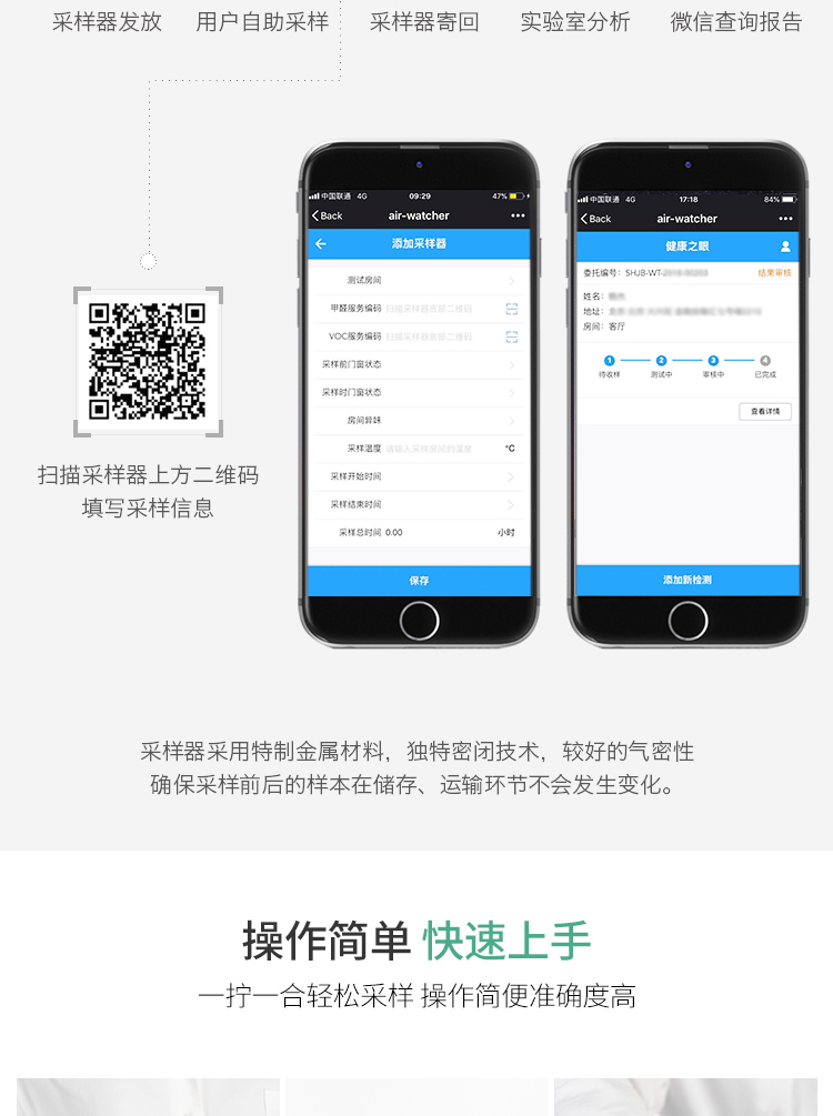 因为新房着急入住,所以很着急检测,上门都要预约,这个采样器检测很方便,今天下的单第二天就收到采样器了。看的出来是专业的团队,检测报告要等的比较久,说是五个工作日,不过4天就出来了,非常感谢,还以为要等到下周呢。还好都合格了,可以搬家了,哈哈。
