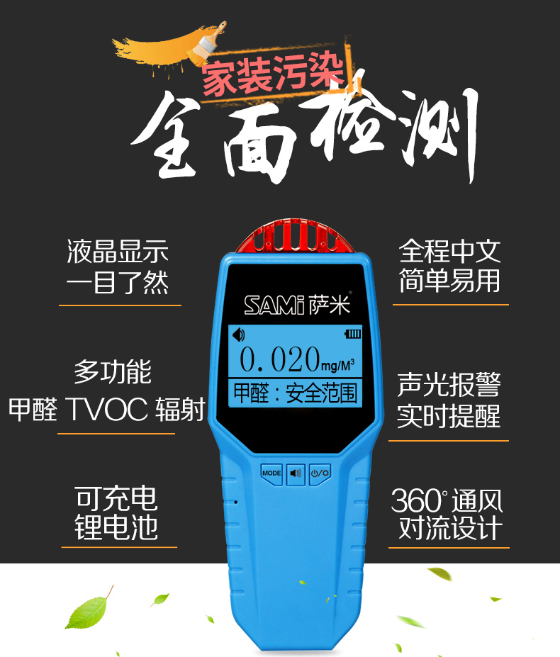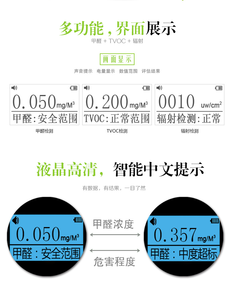 宝贝收到了,用起来方便简单,灵敏度也是非常高,已经在新装修的家里测试一下,有些轻度超标,再晾晾,通通风。过几天再来测一次,为了小孩的安全,家里自备一台还是很方便,很不错的哦
