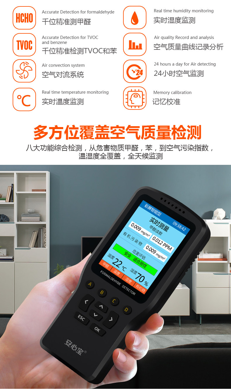 仪器很好,首先外感漂亮,手感舒适,是正品,显示屏分辨率高。仪器使用很方便,按照说明书去操作可以测量到甲酫,挺简单的!家里很注重空气质量,对每个房间做了检测,对比了几次检测的结果,通风条件好的房间甲醛含量低,空气比较好,甲醛含量稍微会高些所以买东西也是比较仔细的。不同的东西数值会显示不同,家用的话我感觉够了。产品便宜好用,推荐给需要的人,好评。查出来家里的衣柜甲醛超标,车里化学品超标,尽早采取措施多通风,多种植物,多放活性炭包
