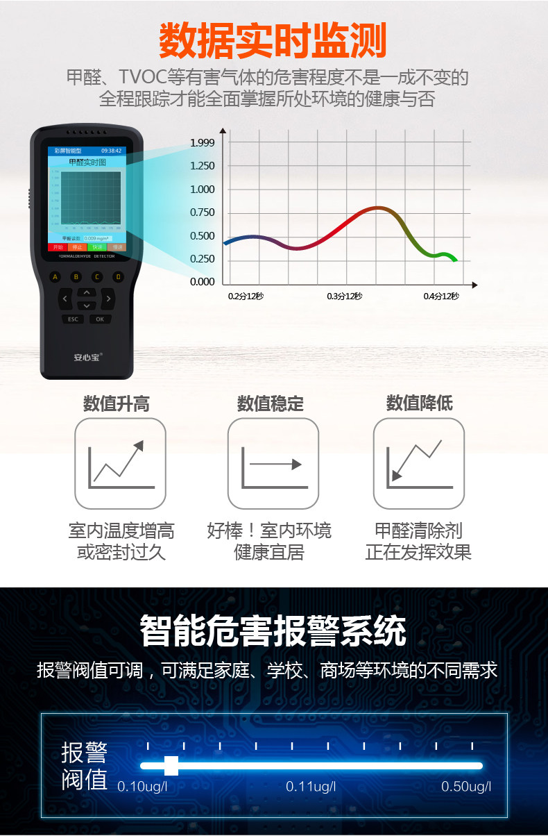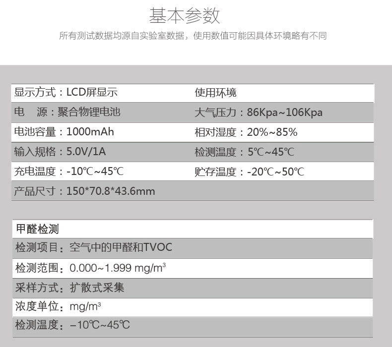 使用方便,挺不错的。质量很好,检测的挺准的 ,数值变化很明显,对比检测了一个有味道的房间和空气较好的客厅,测试结果真是非常大的差别,可见仪器检测的很准。同时我检测邻居家的新房数值没有那么高。总的来说,检测仪很好用,很值得购买做工精致,材质挺好的。检测了好多次,检测出的数值和单位专业测出的数值基本没什么区别。一家人的健康最重要,每个房间测下来基本都符合标准,不错不错,可以收拾收拾放心住新家了。