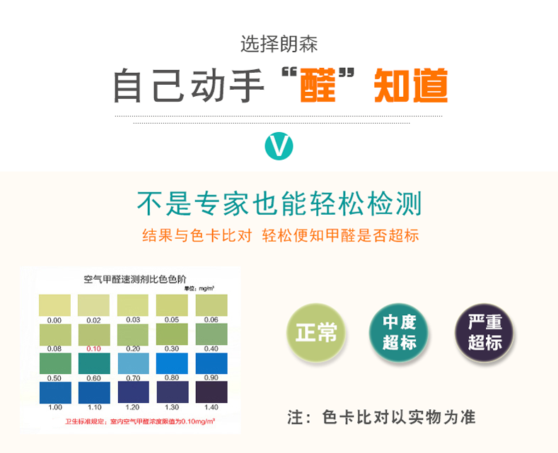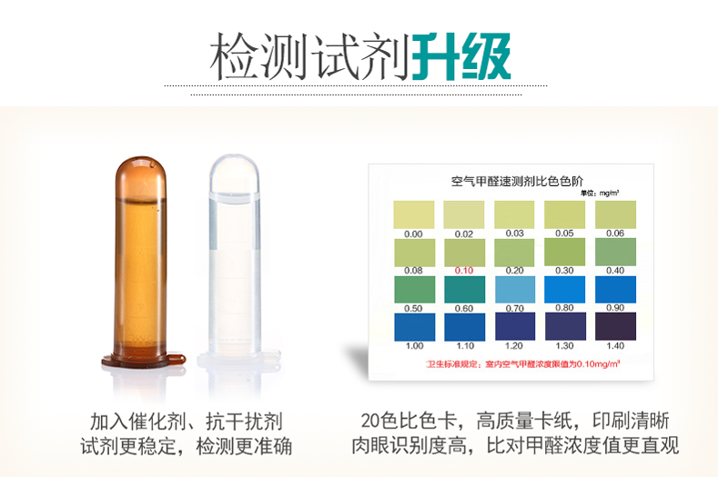 测了几个不同的地方会有不同颜色的反映,我家基本上属于没有很大闻到的;用家用的电子检测仪显示的甲醛和苯系物也是合格范围。但具体两种测试工具是不是有误差无法判定。个人觉得有小孩或者非常介意的家庭最好还是能选择专业机构吧