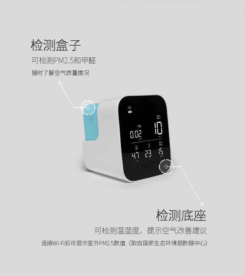 底座平时与检测盒不一定连接,完全可以增加时间和闹钟功能。要不平时就是个摆饰,还费电。