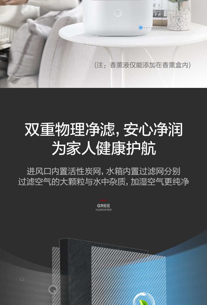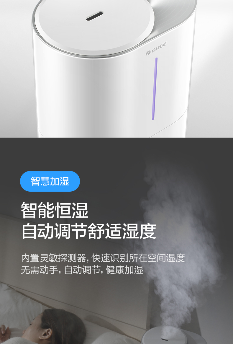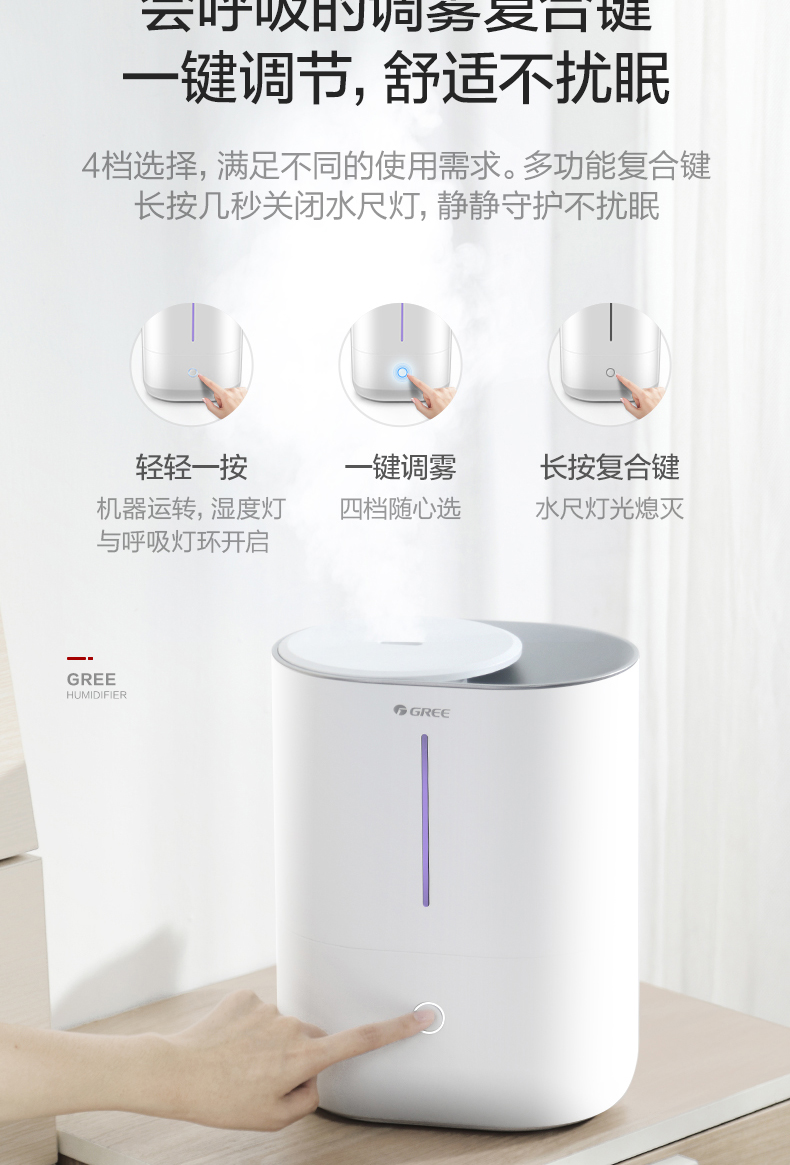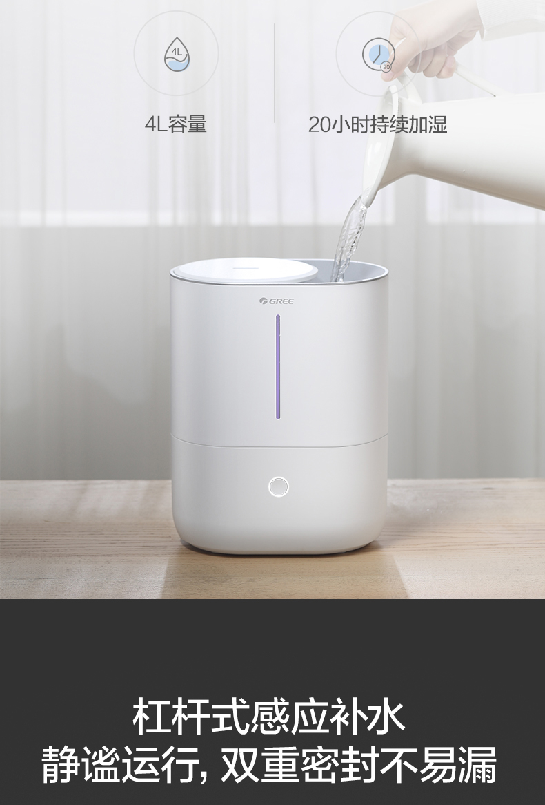 格力的忠实粉丝,这次买加湿器看到格力这款上加水的立马就下单了,上加水的真是方便多了,而且觉得外形也很好看啊,试用了一下声音真的很小,水雾也很细,不会弄湿地面,不愧是格力的产品