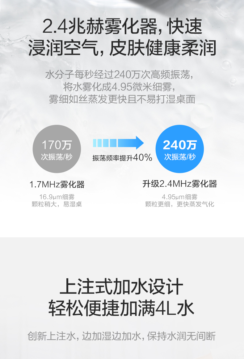 水雾不易打湿桌子地板、静音、加水方便,比原来用的好多了,价格还便宜,性价比很高。