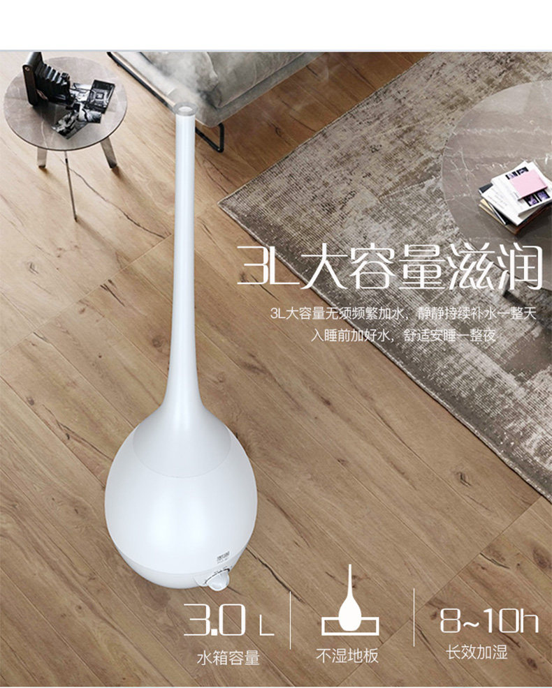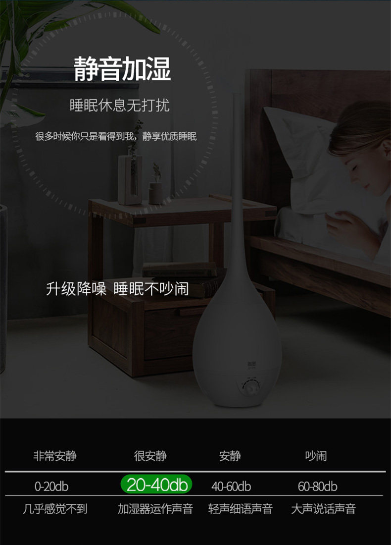 加湿器非常的好,我非常满意,之前买了两个加湿器一个用了几年坏了,一个买了没多久漏水包换,我换了给妈妈用了,在买的这个放床底下藏着免得小孩喜欢玩把水搞地上都是,也不湿床单