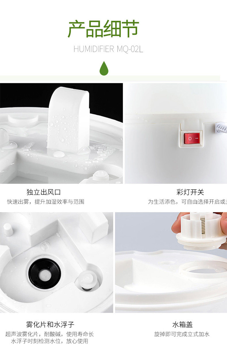 加湿效果:加湿效果还可以 水箱容量:水容量开到最大一个晚上足够了 噪音控制:没有其他噪音,很安静 外观材质:这个外形我很喜欢,很有个性 其他特色:总体来说特别好,喷雾可大可小看个人喜欢,质量很好,没有破损,客服服务态度也好,回购