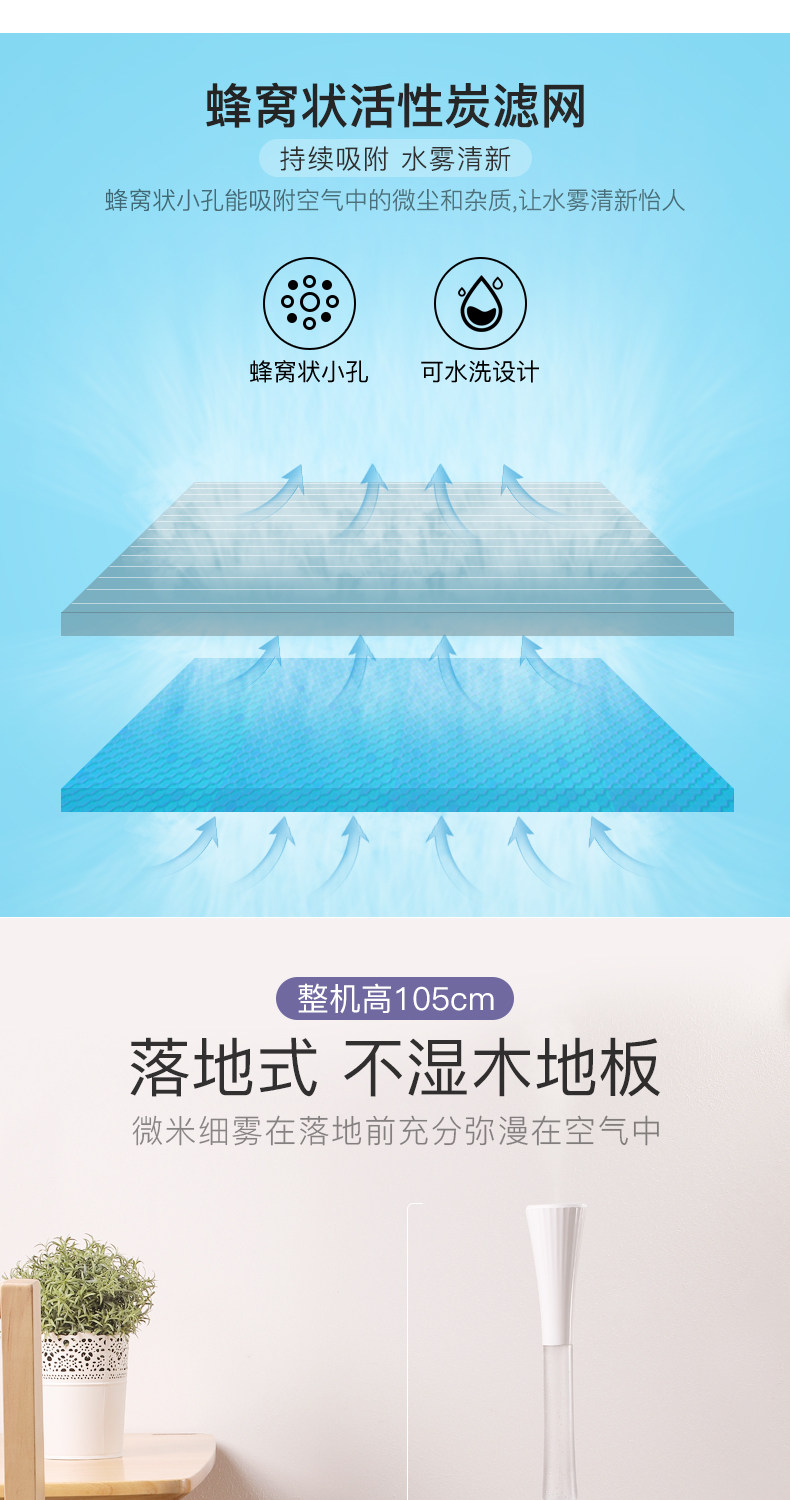 宝贝收到后立刻就使用了,出雾量很大,适宜在空调房使用。特意选择落地式的加湿器,因为落地式的起来放置非常方便,不占用桌子的空间。