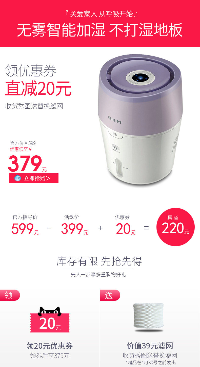 (82)[伟盛电器商城加湿器]空气加湿器家用静音卧室除螨杀菌大雾量月销量99件仅售288元