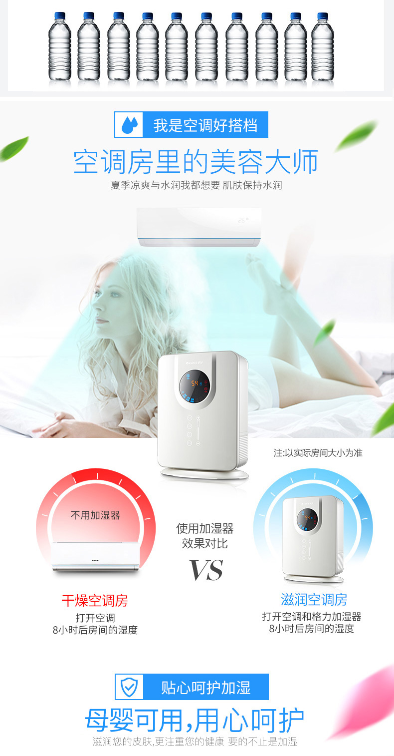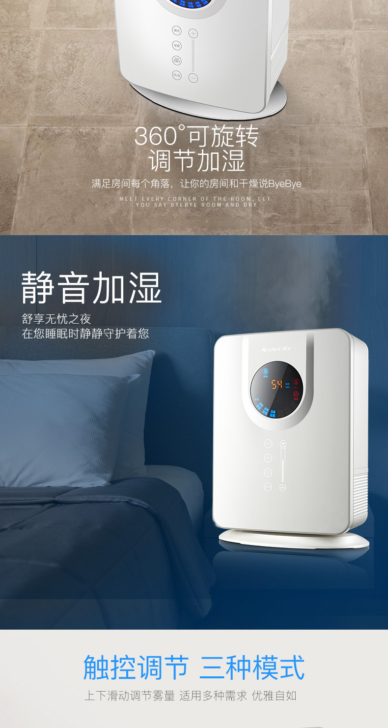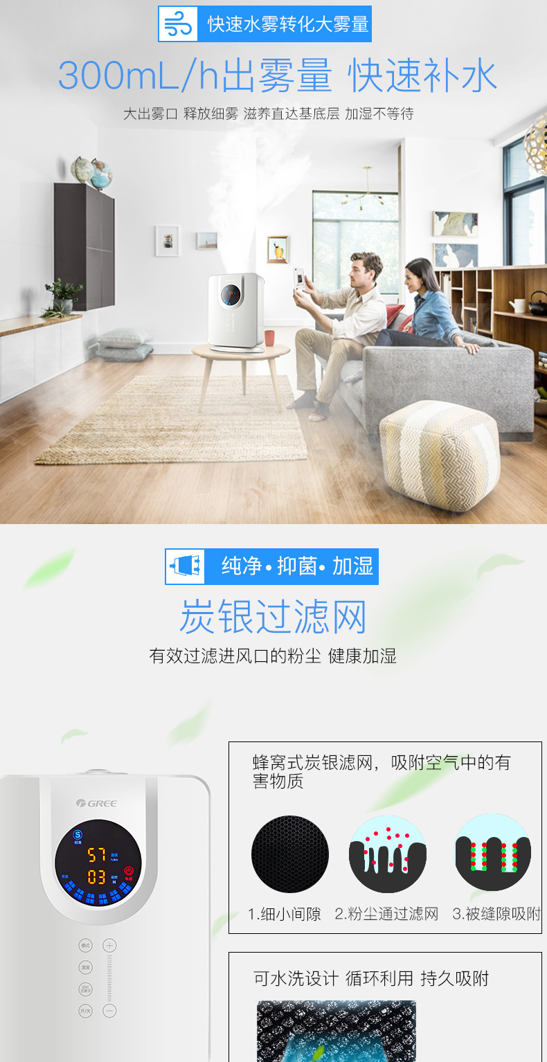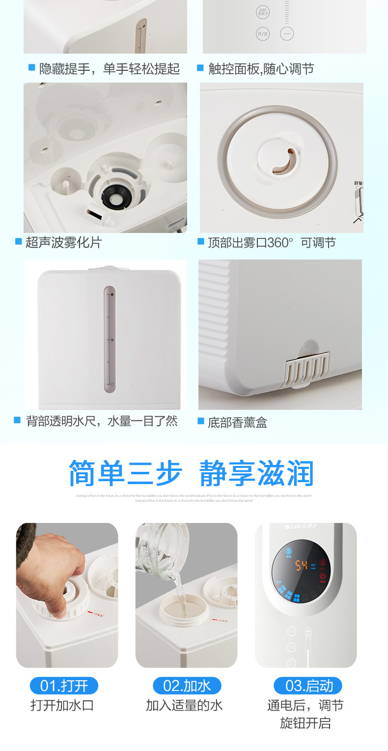 非常好的加湿器,我做了大量对比,除了戴森也就它了,设计非常合理,过滤网跟水是分开的,不容易滋生细菌,我看了飞利浦的几款,都是滤网在水里,那还不如没有滤网,几天就发霉了!格力这款水箱很大,超静音,新机器有点滴水声,用一天就没声音了,没水了会提醒,晚上睡眠模式时,灯光只剩下开关还亮着,不会影响睡眠,出雾非常细,完全不湿地板,颜值也相当高,诚心推荐,特别是有宝宝的家庭,买家图很多,我就不上图了