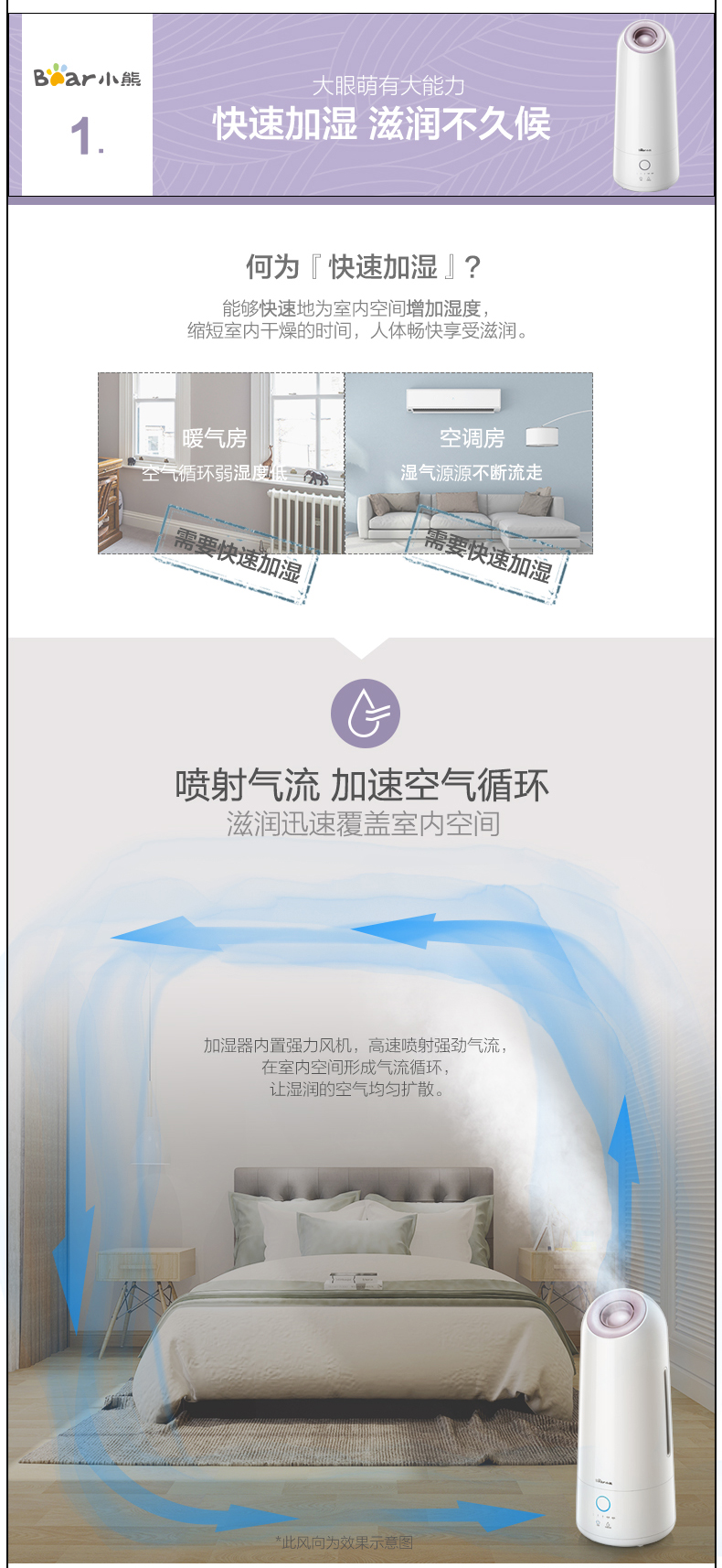 小熊电器效果挺好。雾气是向上飞的,这点挺好,但是感觉风机有些声音,不清楚时间长了会不会更大。
