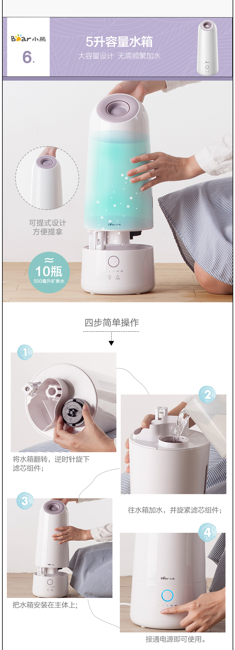 大容量加湿很好每晚都是一整晚感觉鼻子和喉咙都不疼了,而且还有很多种模式,期待改成上注水会更便捷