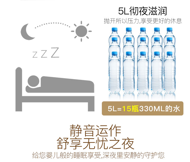 好评!好评!!好评加!!!当天拍下后不到一小时就发货了的这种速度真的是要盛赞!其次是产品本身也非常非常的好 买的是普通款的 但也非常好用 简单方便 5L大水量非常的方便 我是每天晚上开 大概能用三个晚上 产品真的是无噪音静音环保 100块钱买了这么实惠的物品 真的是物超所值!