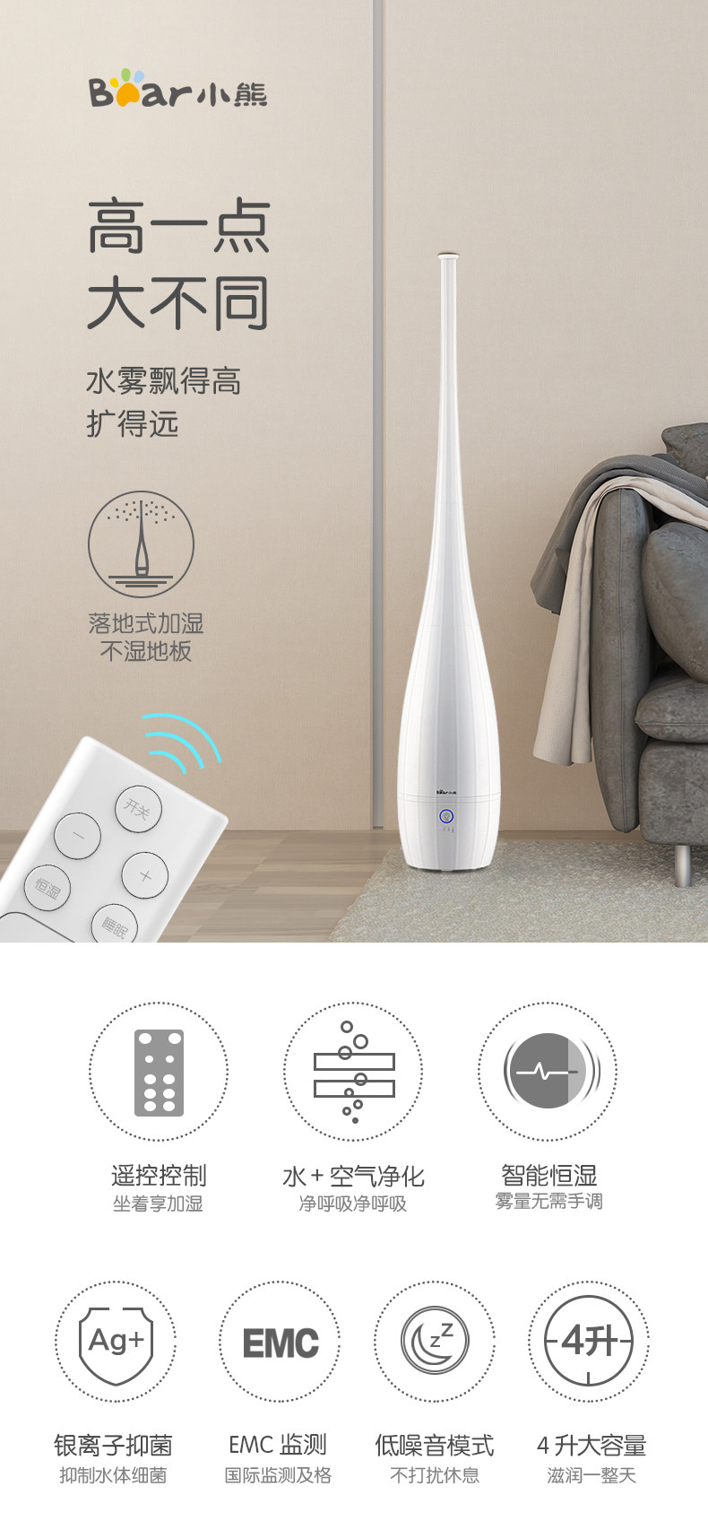 颜值蛮高的,适合面积大的房间。一次加满水能用好多天。缺点:1.水箱上面是四节拼起来的,不如一整根的。2.并不能恒湿,不能智能调节出雾量。即使屋子里都雾气昭昭的了,它也还是在照常喷雾。