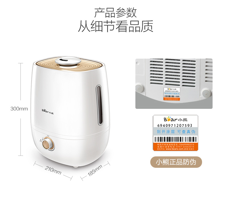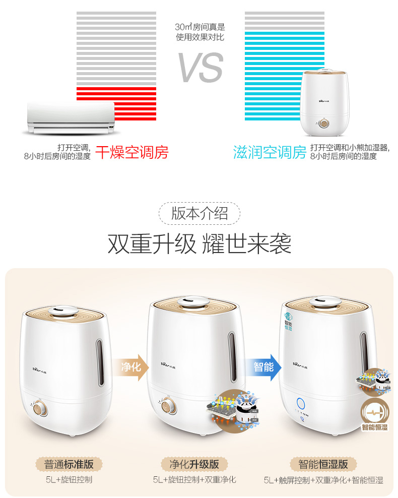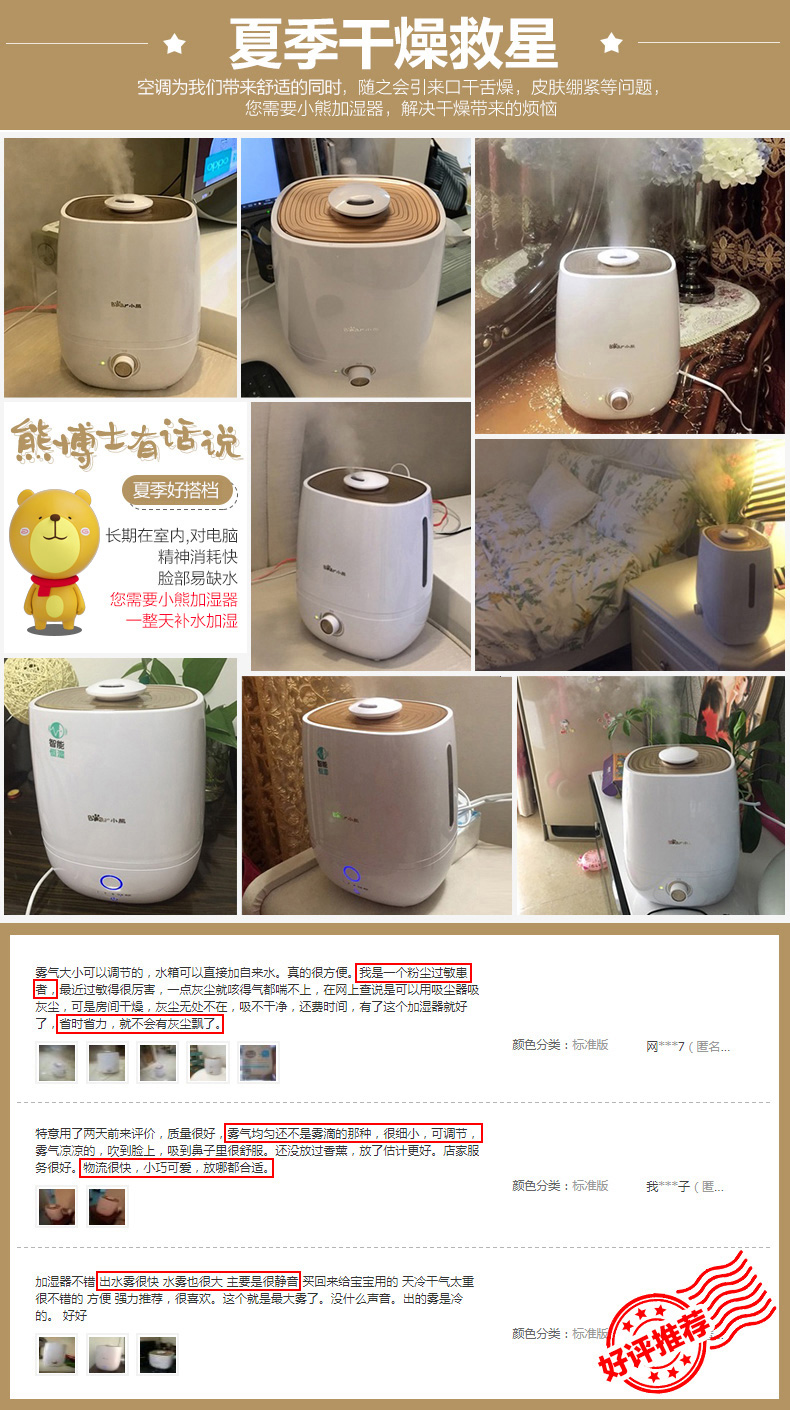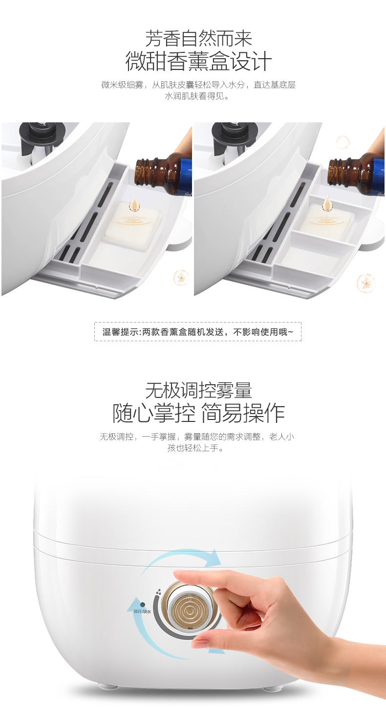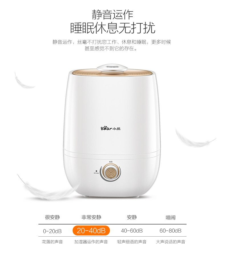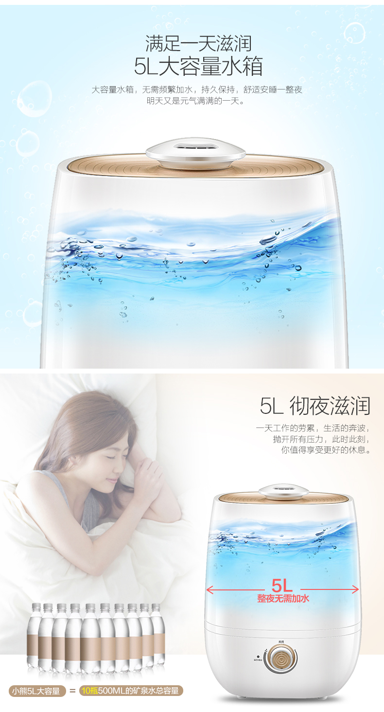 买过的朋友推荐我买了,不错。容量够大5L装,装了一半的水开了一晚上还有水,够大,声音也很小,晚上睡觉安心,外观也比较好看,烟雾也很大,也可自由调节。