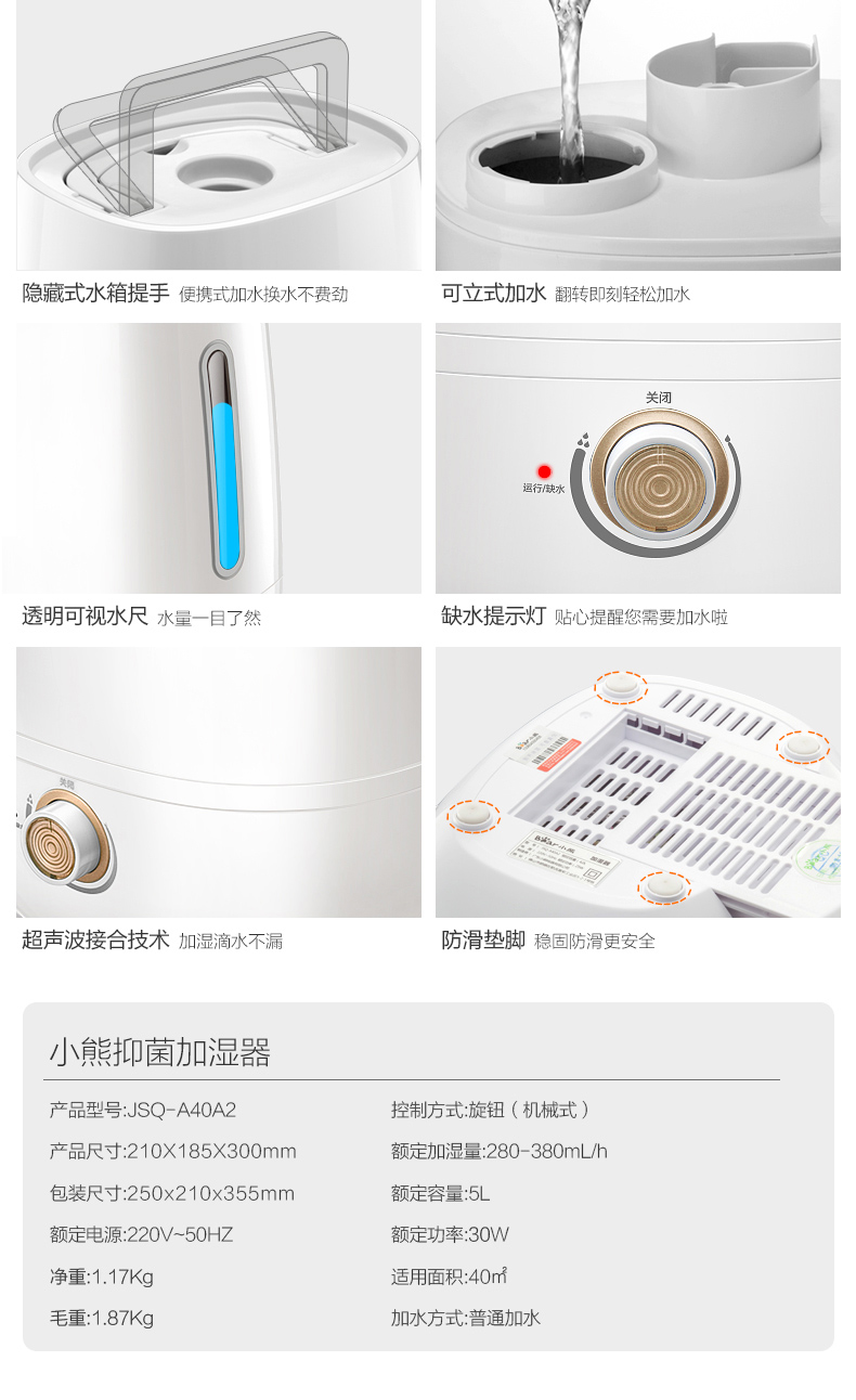 加湿效果:不错,一晚上师傅可以达到60% 水箱容量:满水可以用两晚 噪音控制:算是比较小的,再卧室也不吵 其他特色:上面的盖子可以拿下来,里面有个提手,这个设计还挺好的