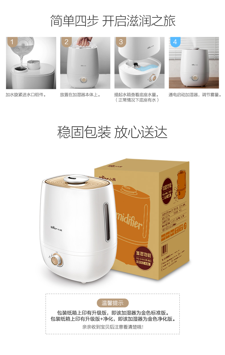 加湿器收到了,很好用,就是雾气比较大,开小档,一晚上水就干了