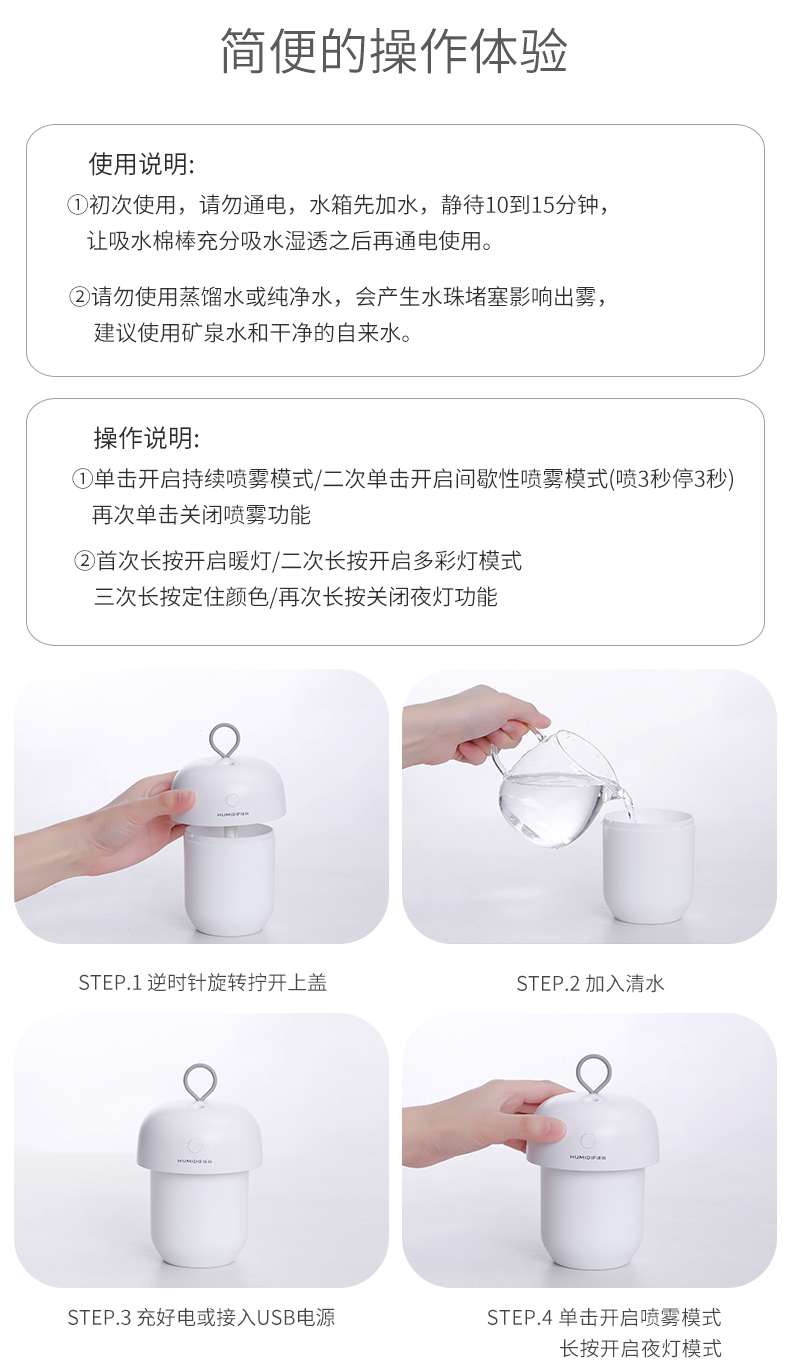 有很多功能呀然后两种喷雾模式三种灯光模式 喷雾的时候很轻柔没有声音(反正就是很小很小基本上听不到就对啦)还送了一个小灯和小风扇真的超酷!客服(售后007)也是真的耐心 一口气解决了我很多的小疑问(可能大家也会和我有一样的问题哈!戳下面的截图来帮大家参考一下!) 因为是小米旗下的产品 知名公司的话怎么着都要比那些其他乱七八糟的加湿器有保障吧 很棒的加湿器 放在宿舍刚刚好 不占地方也不会吵到周围的舍友 睡觉的时候也可以放在枕边 是自己可以断电的!超nice