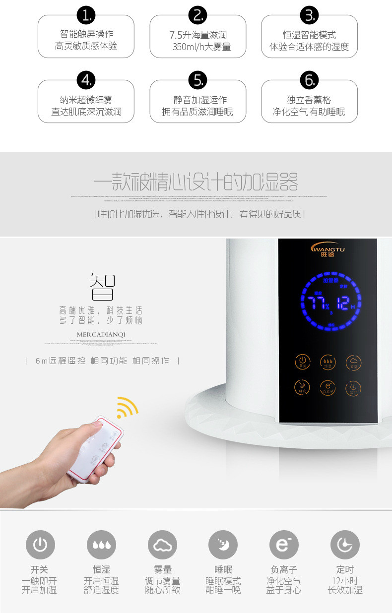 智能版: 1、电脑版自动恒湿功能 2、超大触摸显示 3、触摸调雾量大小 4、定时功能 5、负离子净化空气 6、带遥控器功能 7、液晶屏可开可关!