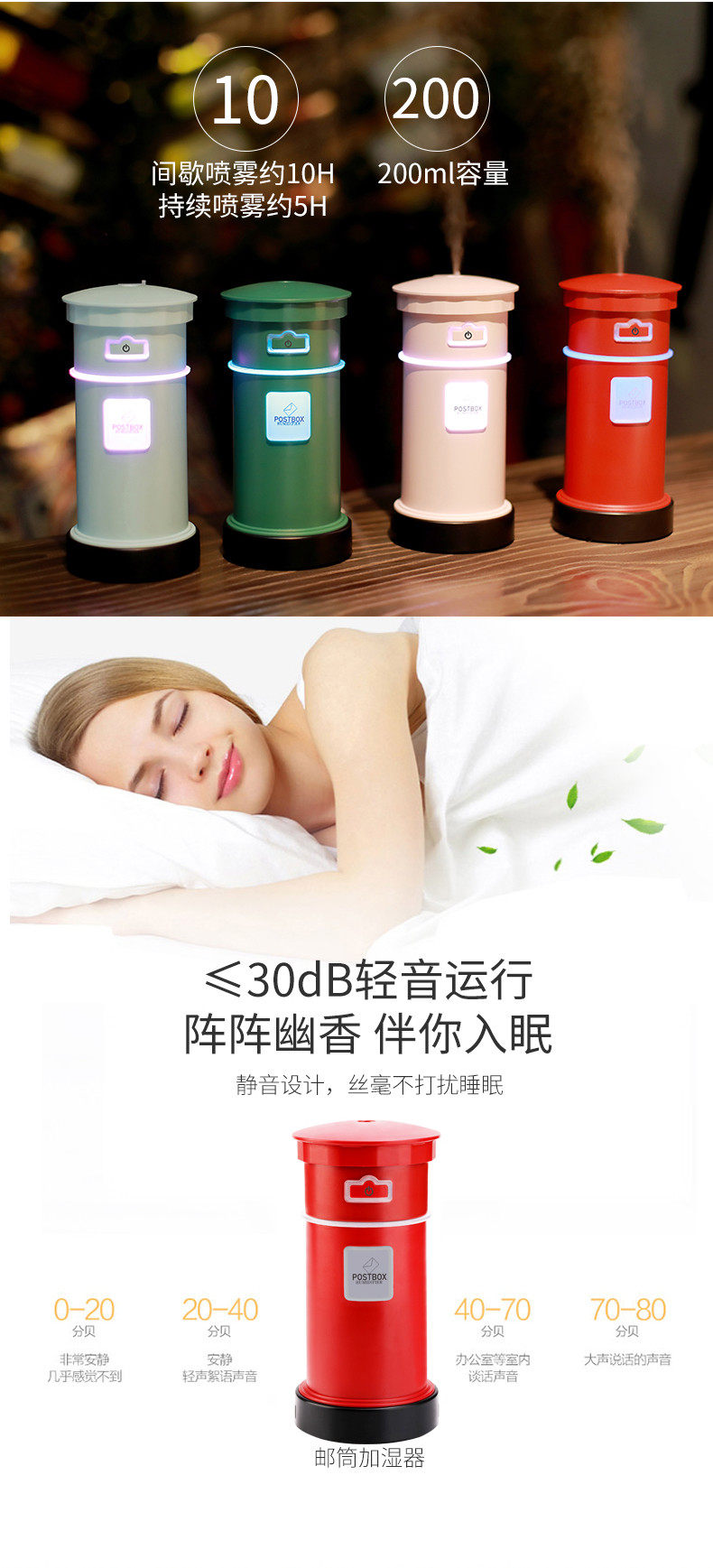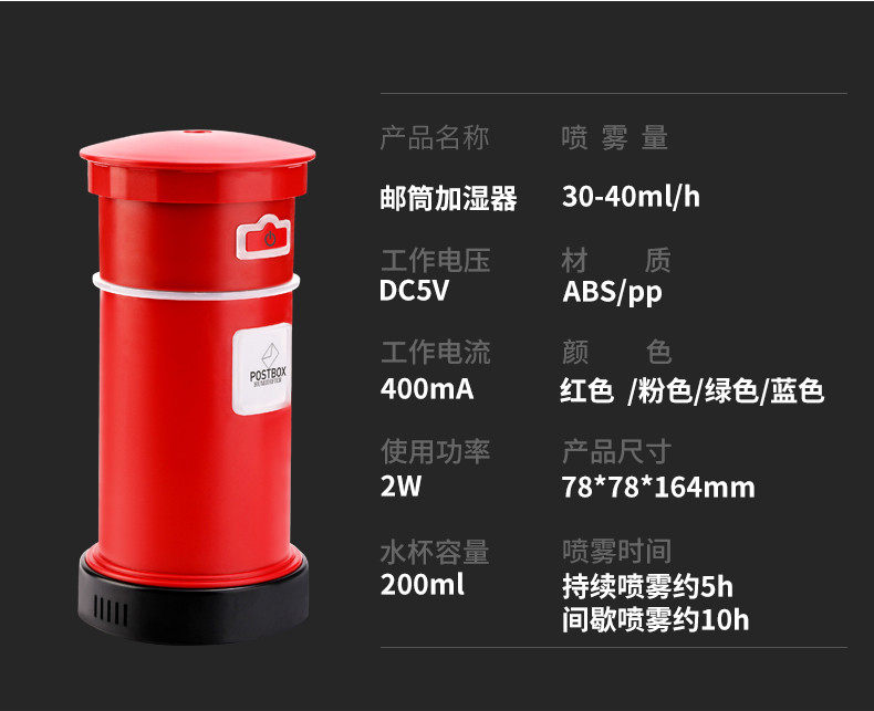 加湿器造型很可爱,有夜灯功能,夜晚睡觉前加满水可以连续工作七个小时左右,可以加点香薰,睡觉很舒服,不会再干燥了。喷出水雾周围也没有出现大水滴的现象,很棒!