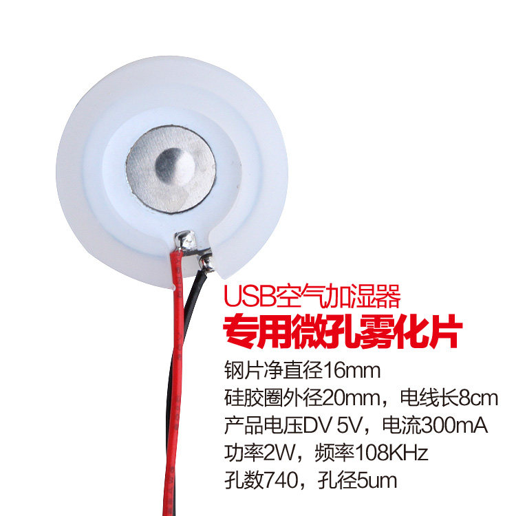 雾化片钢片净直径16mm,硅胶圈外径20mm,电线长8cm。产品电压DV 5V,电流300mA,功率2W,频率108KHz,孔数740,孔径5um