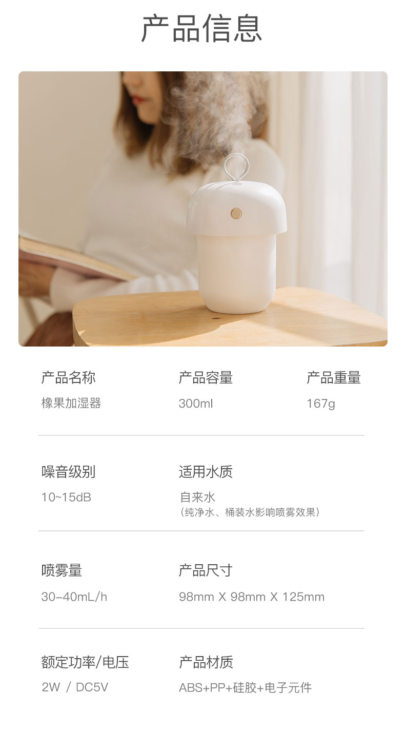 小小一只,很可爱的加湿器,雾量很大,很喜欢很小巧,带着非常方便,喷出的雾很细操作简单,小巧玲珑的,很好看,也很实用,不占地方!真好,静静的,没有声音。喜欢!静音晚上开着睡觉一点也不吵,桌子上不会有小水珠,睡一晚上起来嘴巴,喉咙,都是干的,现在有了加湿器屋里就好很多,嘴巴喉咙都不干了,空气也好很多了,很不错