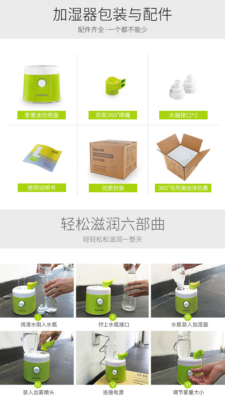 索爱加湿器迷你家用静音卧室办公室桌面小型矿泉水瓶便携空气空调