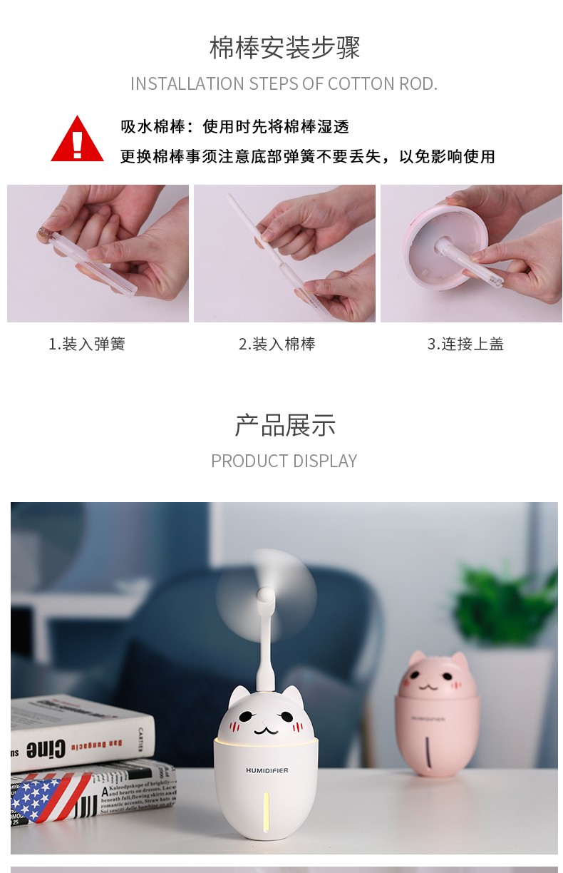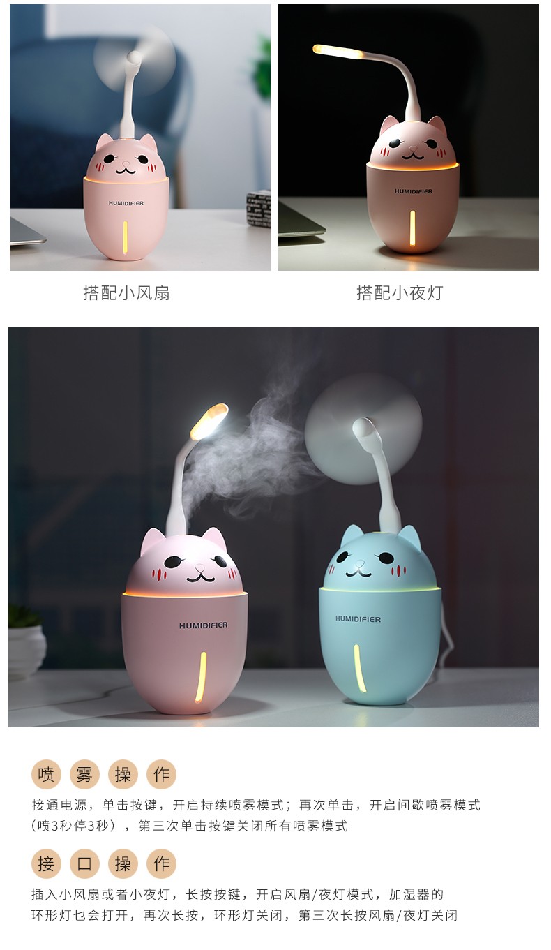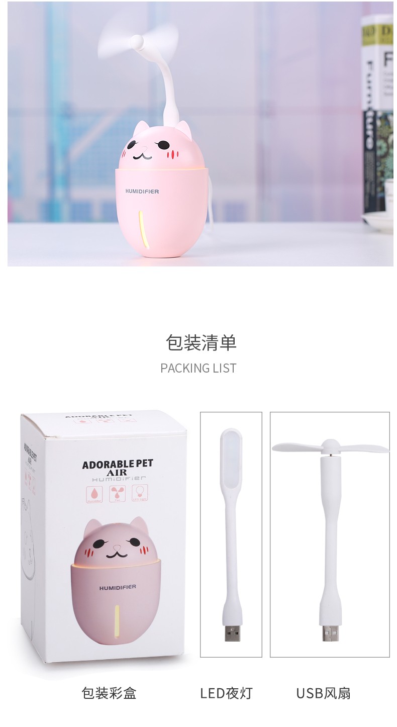 包装特别精美,很适合送人礼物用。可惜我是自用,浪费了这么漂亮的包装。自己就拆开了。加湿器本身很可爱,水雾细腻,还送了一根过滤棉棒。小风扇设计很合理,风力还很足来!夏天用很合适。夜灯也很漂亮,非常满意!