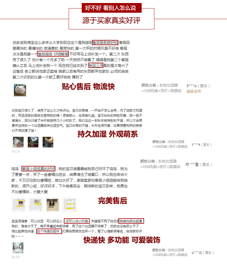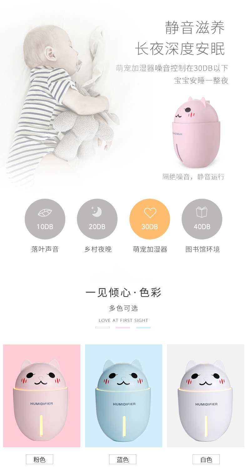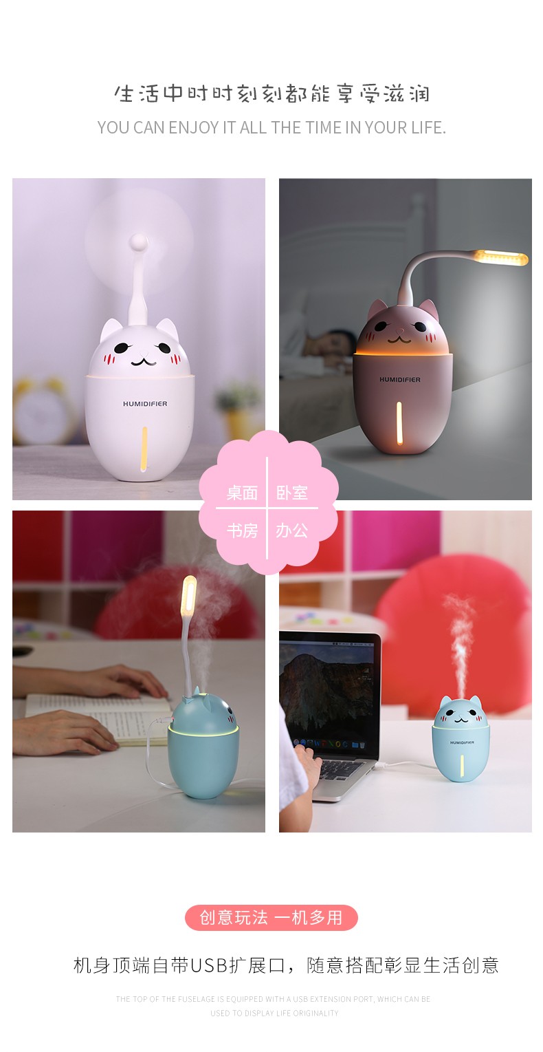 包装特别精美,很适合送人礼物用。可惜我是自用,浪费了这么漂亮的包装。自己就拆开了。加湿器本身很可爱,水雾细腻,还送了一根过滤棉棒。小风扇设计很合理,风力还很足来!夏天用很合适。夜灯也很漂亮,非常满意!