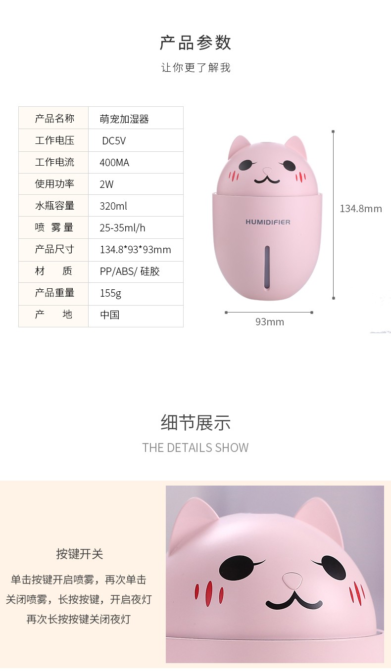 买来送朋友的小礼物,包装真的超级棒,很精美,包装袋以及送的卡纸都很好,而且真的很可爱,朋友很喜欢,喷出来的雾气不大不小,很合适,还送了2个小东西,风扇和电灯,都很好用。按钮不会操作,客服也很耐心讲解了,还有这个物流超级棒,2天就到了,真的很赞很值得购买。