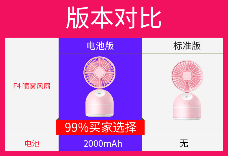 看上了这个喷雾功能,相对别的小风扇我觉得好很多了!而且充满电可以用挺久的!带喷雾加湿,这个价格相当于买了一个加湿器+一个风扇,性价比高。