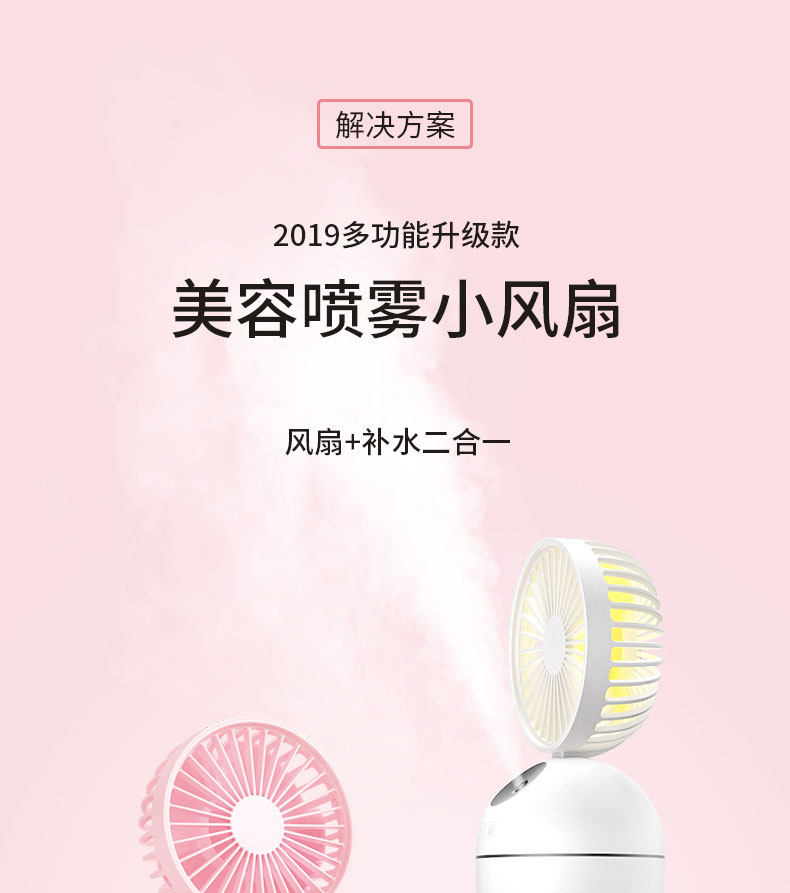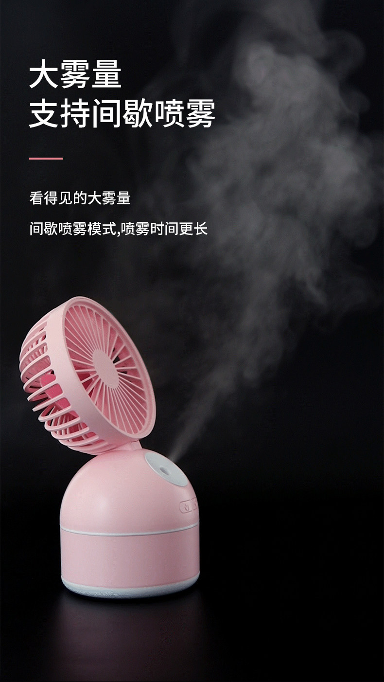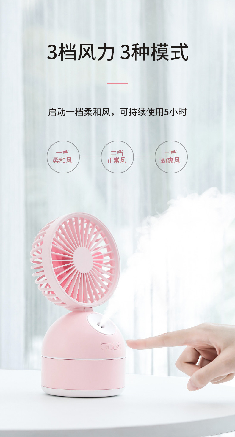 颜色好看,粉粉的,有两个功能呢,风扇加水雾,让这个夏天更凉快,放在办公室很合适,夏天开了空调,空气有点干燥,用这个就舒服多了