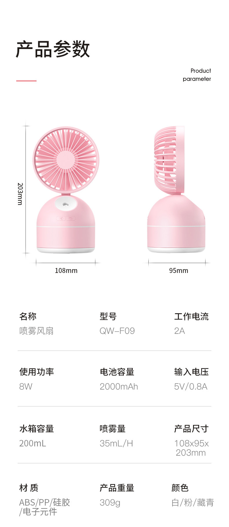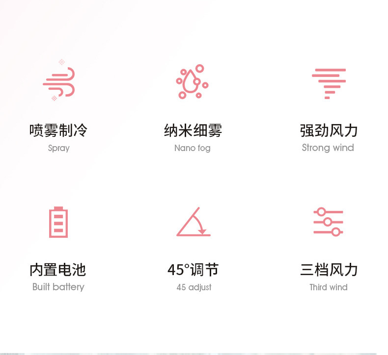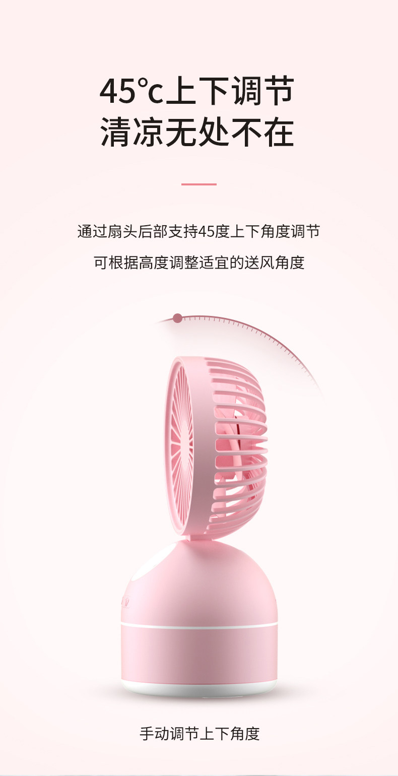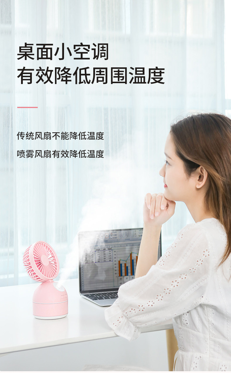 颜色好看,粉粉的,有两个功能呢,风扇加水雾,让这个夏天更凉快,放在办公室很合适,夏天开了空调,空气有点干燥,用这个就舒服多了