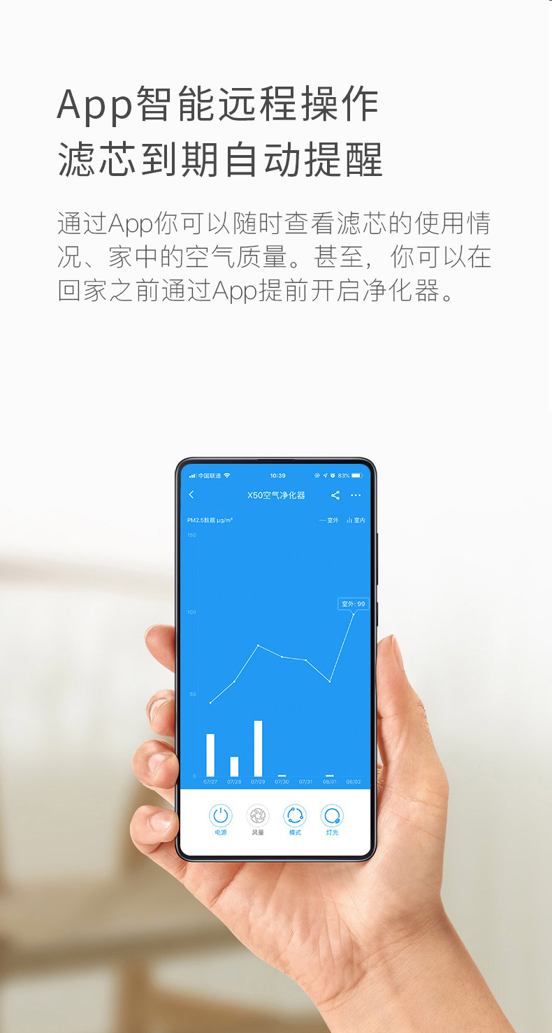 物流速度超快!零点下单,下午就到了!北方雾霾天必备。已经是第二个了,这个比x83小,也更安静。关掉灯都感觉不到存在。不过和x83一样,都是2017年生产的,不过客服妹妹说不影响功能。