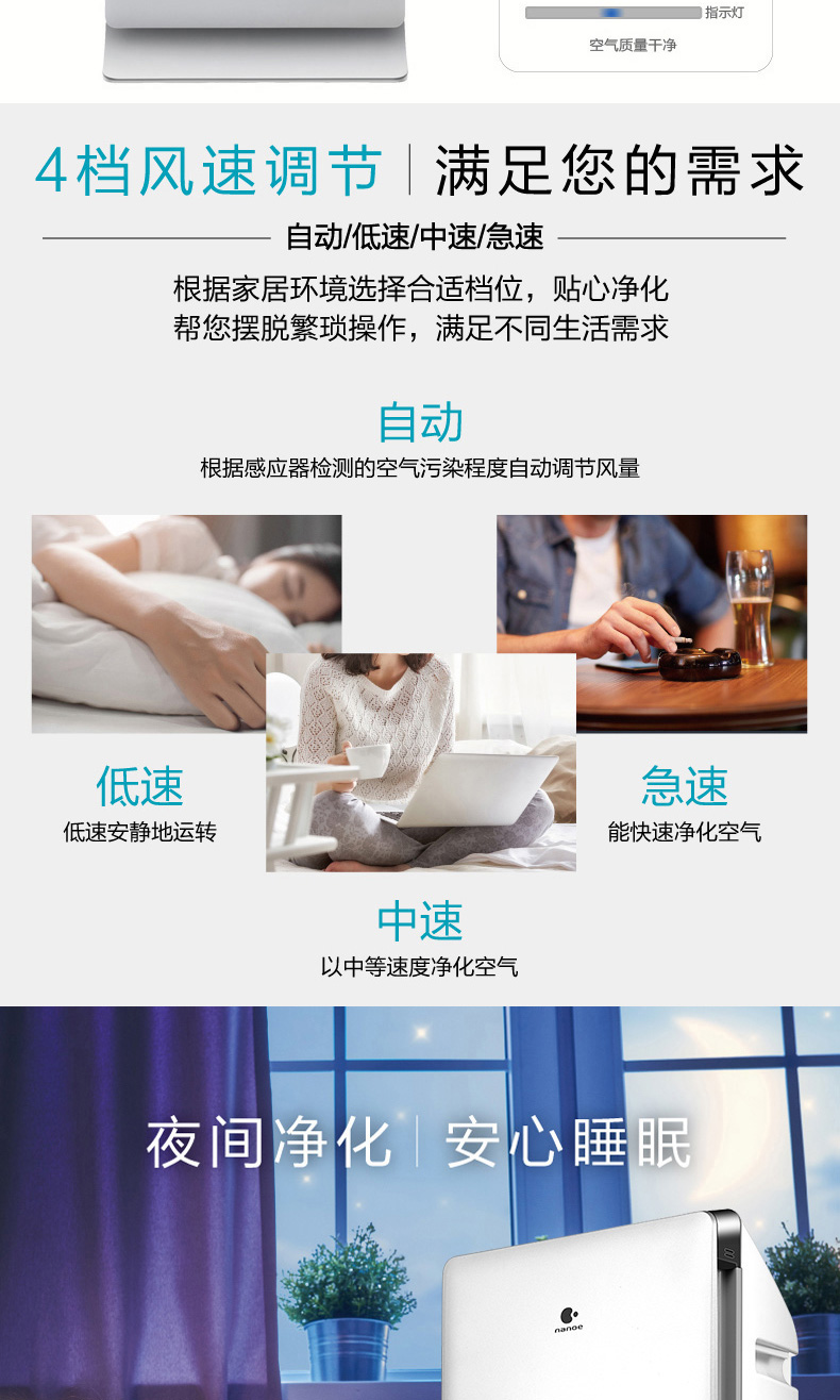 好评!满意!同此型号,已是在使用好感后、购入第三台了。店家的双层包装,运输快捷完好。外型美观漂亮、不占地方,运行噪音极低,除臭、除异味效果非常好,特别是长时间使用"纳米水离子"功能,丝毫不觉微臭氧导致的臭氧味及产生头痛不适,而是滋润温湿所带给鼻腔、气管及肺部的享受,受众者日久必获愉悦感,这是该品牌设计上的最大闪光点;对异味监控亦十分灵敏,只要您试用食指沾一点碘酒,靠近吸风口,不一会,LED彩灯即告警有异味超标,真是服了;好戏连台,贵店还在购货后,暖心酌情寄地送礼品,令人十分感动电商之贴心!又感悟:若君舍得购车而忽视空滤设备投资使用,过着"舍滤保车"的日子,或不算完美也。享受高质睡眠,幸觅此机!