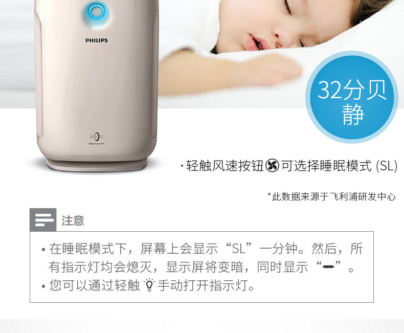 因为家里刚换了新墙纸,就想买一个空气净化器净化空气去去甲醛。飞利浦首先外观很漂亮,开启的时候是蓝色,等一会就变成紫红色、红色……开启最大的风速声音会有点嘈杂,白天开启最小风速的话感觉不到声音,很安静。现在客厅、卧室、儿童房轮流用,希望真的能去甲醛净化空气。给孩子一个安全的环境。好评!