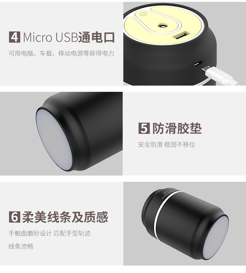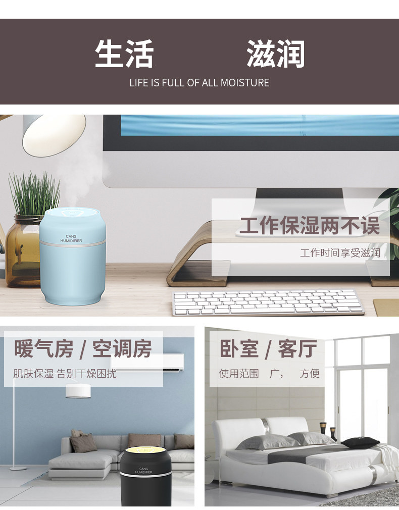 小巧 携带方便,晚上放床柜 白天放办公桌 出门放车上 真是想怎么用就怎么用,而且静音,大雾量,冬天不怕干燥,晚上夜灯还那么漂亮,效果不错,物流快,满意!