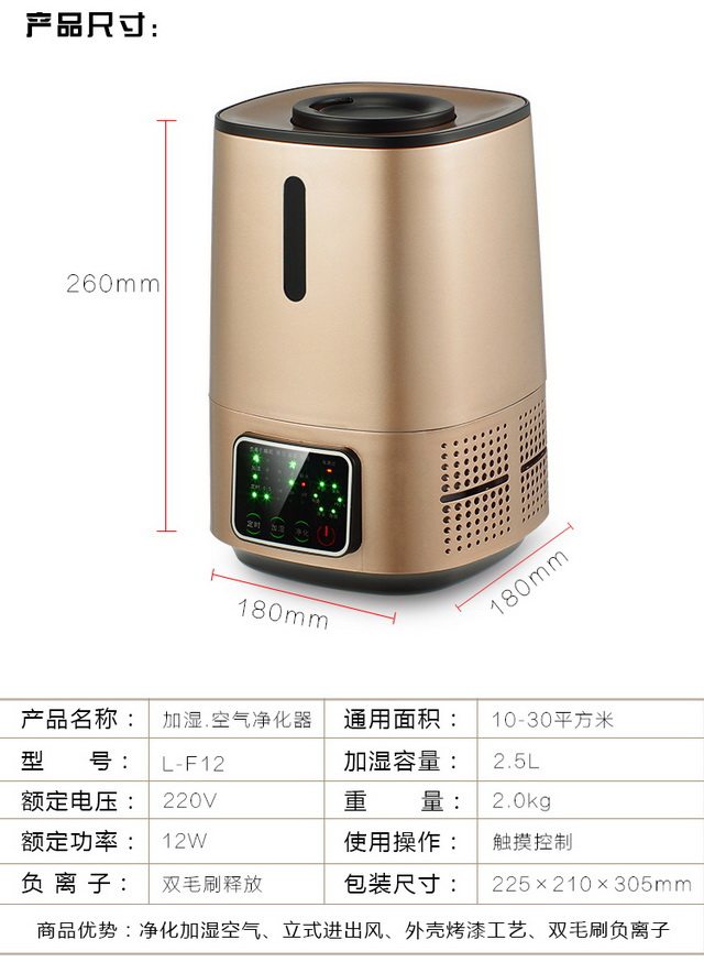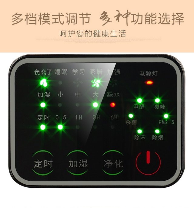 • 功能:定时 除VOC 除花粉 除颗粒物 除甲醛 除烟除尘 杀菌 加湿 除雾霾 除菌, 负离子 除菌