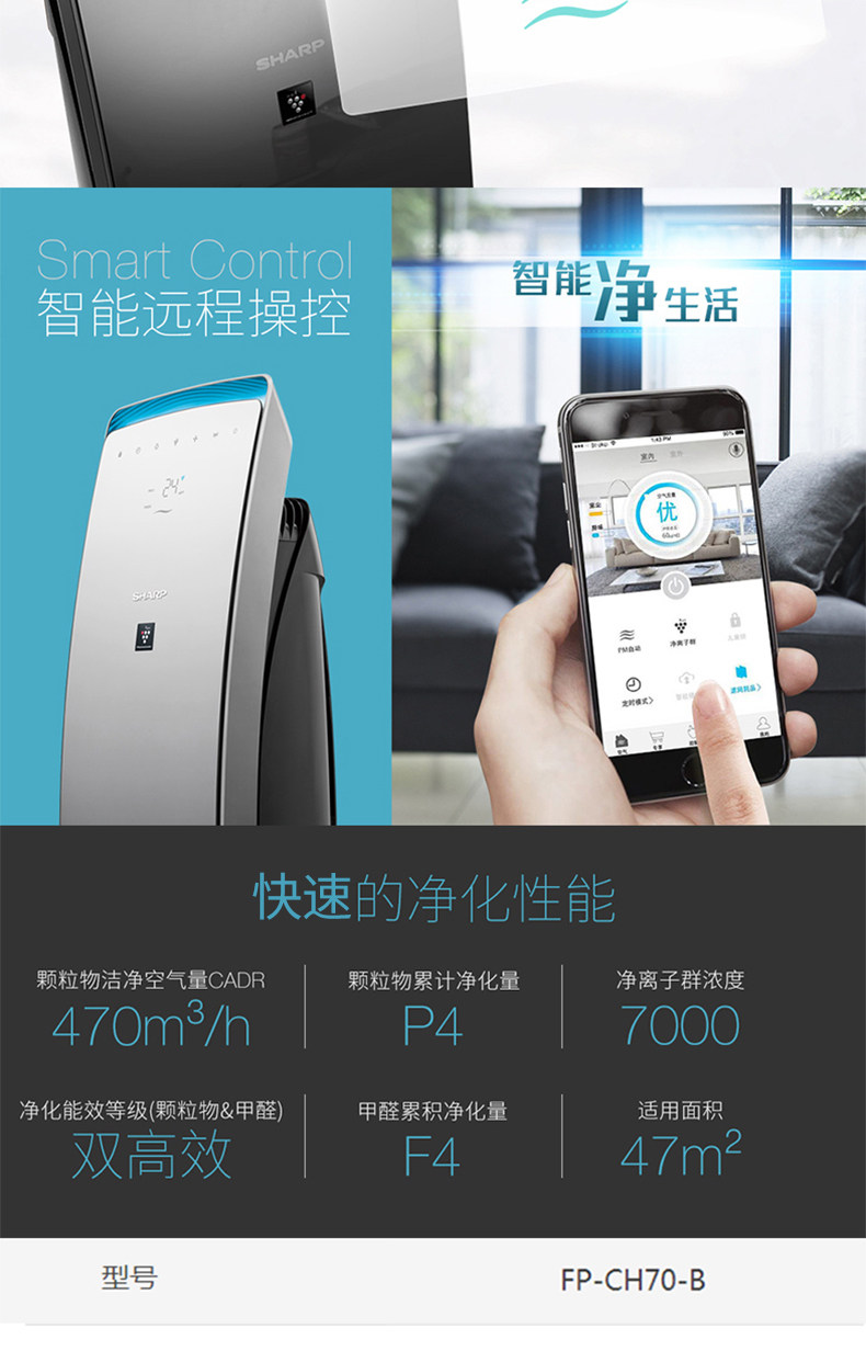 夏普空气净化器FP-CH70家用智能远程遥控卧室除甲醛烟雾霾PM2.5