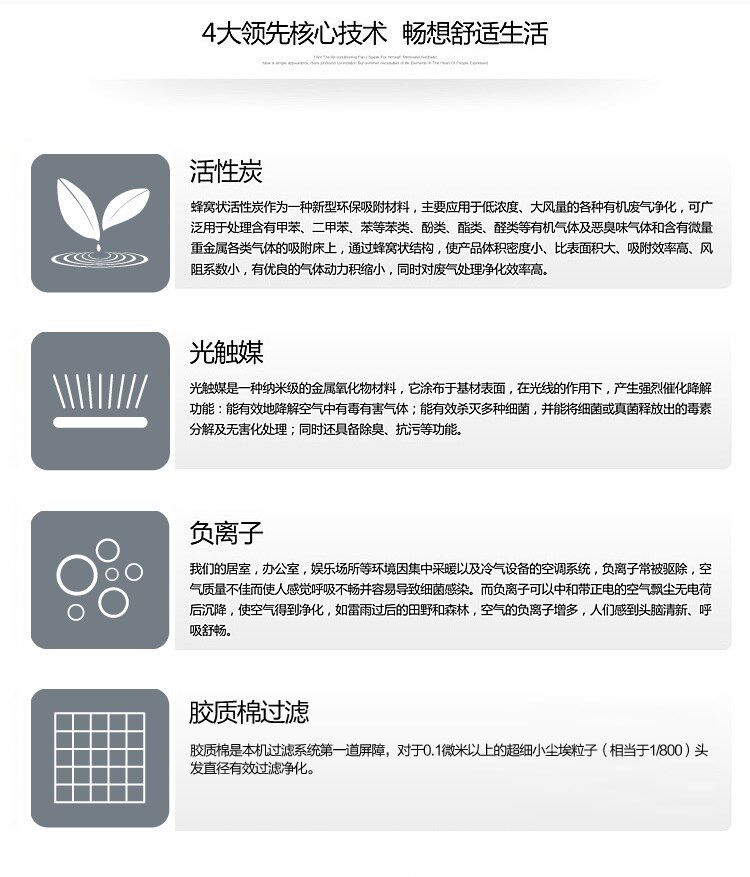 • 工作原理:活性炭 负离子 臭氧 光触媒