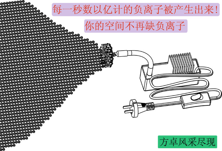 温馨提醒:本产品功率大,负离子浓度高,请与其他家电保持60cm以上距离,以免损坏给您带来不必要的损失。因但产品输出高压高,所以离子风还是很强劲的。故产品价格低廉。因本款浓度高,如果购买铍铜金针释放器的用户请知悉,不管很多其他商家说这针那针的,说白了都是忽悠你们,每个铍铜金针只有一个尖点,而一片板子上就那么几个头,分摊到一个尖点的肯定大,而产生臭氧的前提条件就是电流过大导致,很多商家为了宣传臭氧低,前提就是人为的把机器模块输出高压降低而已。尽管使用金针去除异味、甲醛效果好,但是毕竟有臭氧,建议使用时开一点窗户。