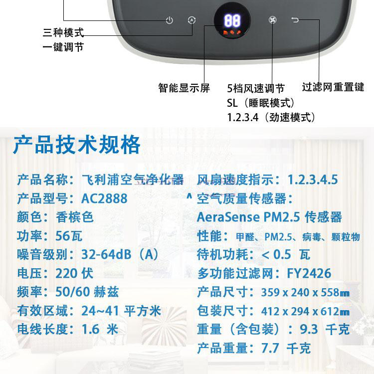 飞利浦空气净化器家用办公智能除甲醛除雾霾PM2.5AC2888正品