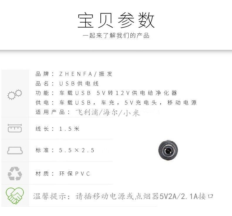 使用方法:圆孔插净化器,USB接口插点烟器,移动电源,手机充电头5V2A/2.1A接口。