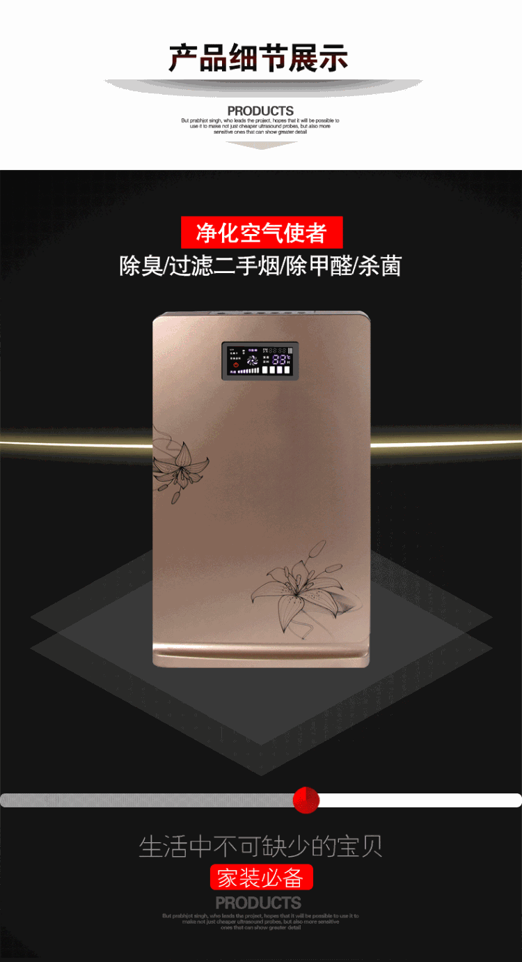 • 功能:定时 除花粉 除甲醛 除烟除尘 杀菌 加氧