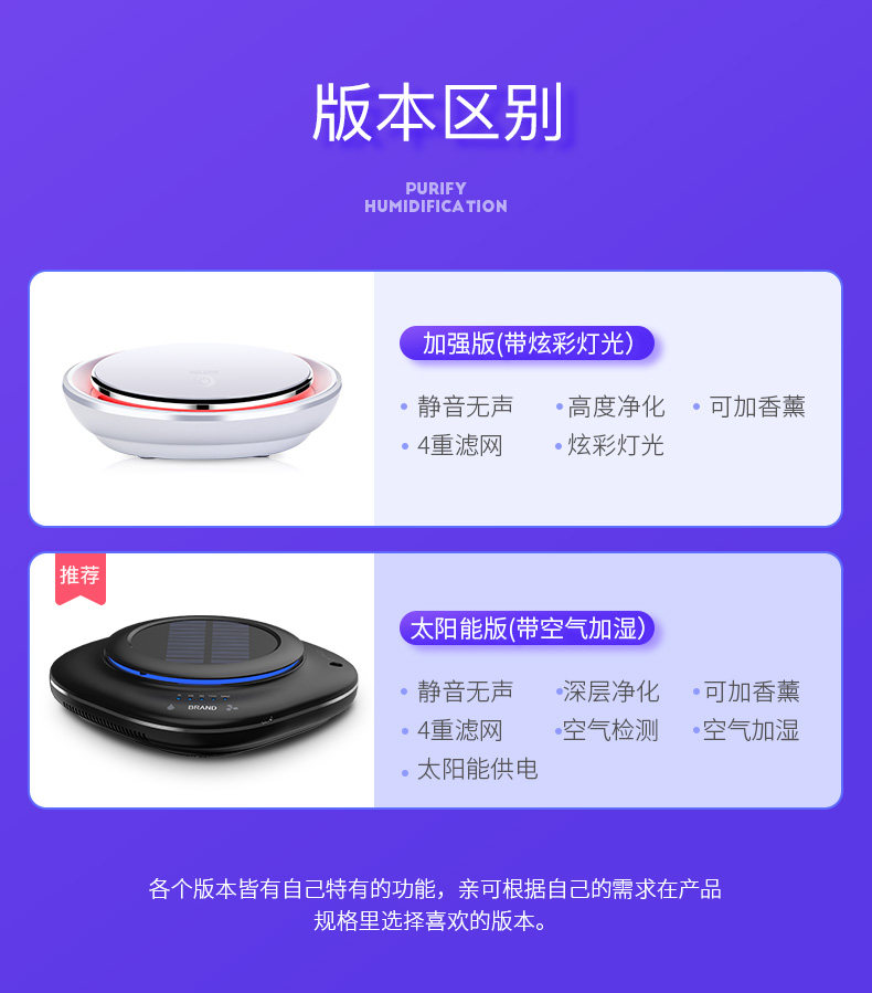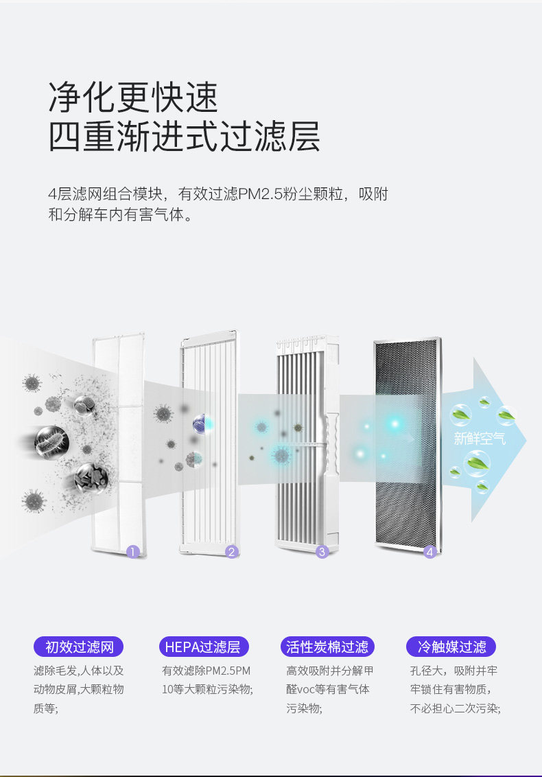 • 净化原理:HEPA滤网 活性炭 等离子 紫外线 负离子 静电吸附