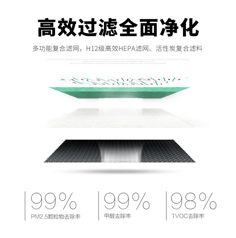 4. 高效纳米杀菌涂层板,多重过滤系统:活性炭过滤层+光触媒过滤层。