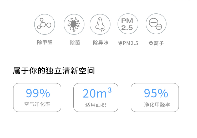 • 功能:除颗粒物 除花粉 除VOC 除甲醛 除烟除尘 杀菌 加氧 除雾霾 除菌, 负离子 除菌